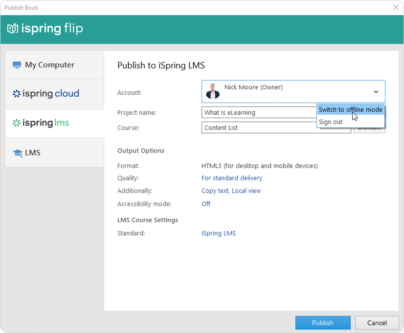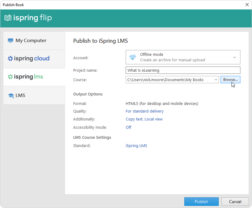 If your computer is disconnected from the Internet or online publishing doesn't complete because of an antivirus program or a proxy server error, you can upload the book to iSpring LMS manually.