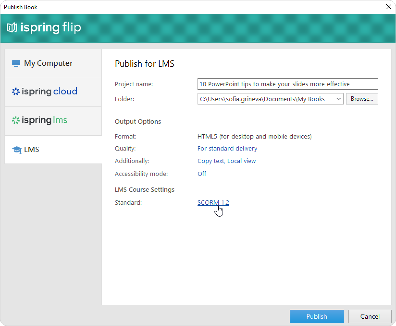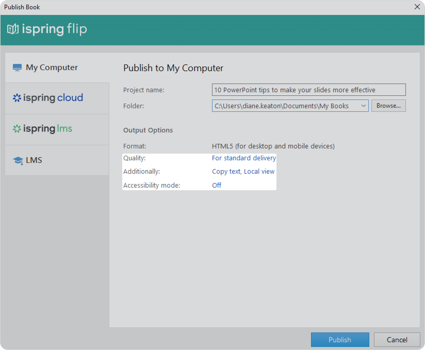iSpring Flip Publishing Books Current: Publishing Options Publishing Options Change book publishing settings in the Output Options section.Quality settingsAvailability and security settingsAccessibility mode settingsIf you are publishing a book to an LMS, you will be able to choose an LMS standard. Learn how to do that in the LMS Profile Settings article. ×