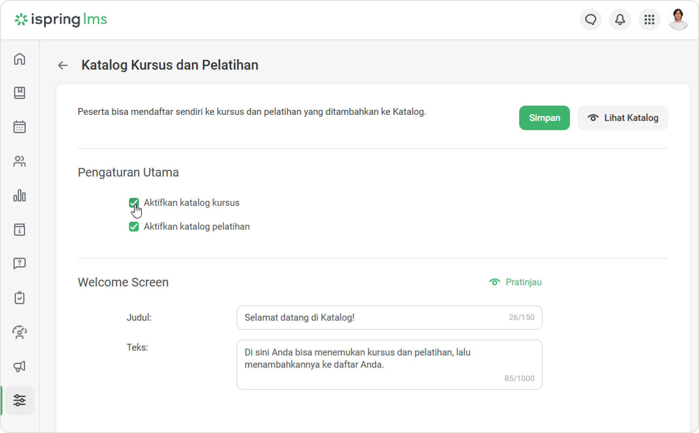Aktifkan katalog di pengaturan agar supervisor dapat merekomendasikan kursus dan pelatihan. Sistem akan memberi peringatan jika katalog tidak diaktifkan.