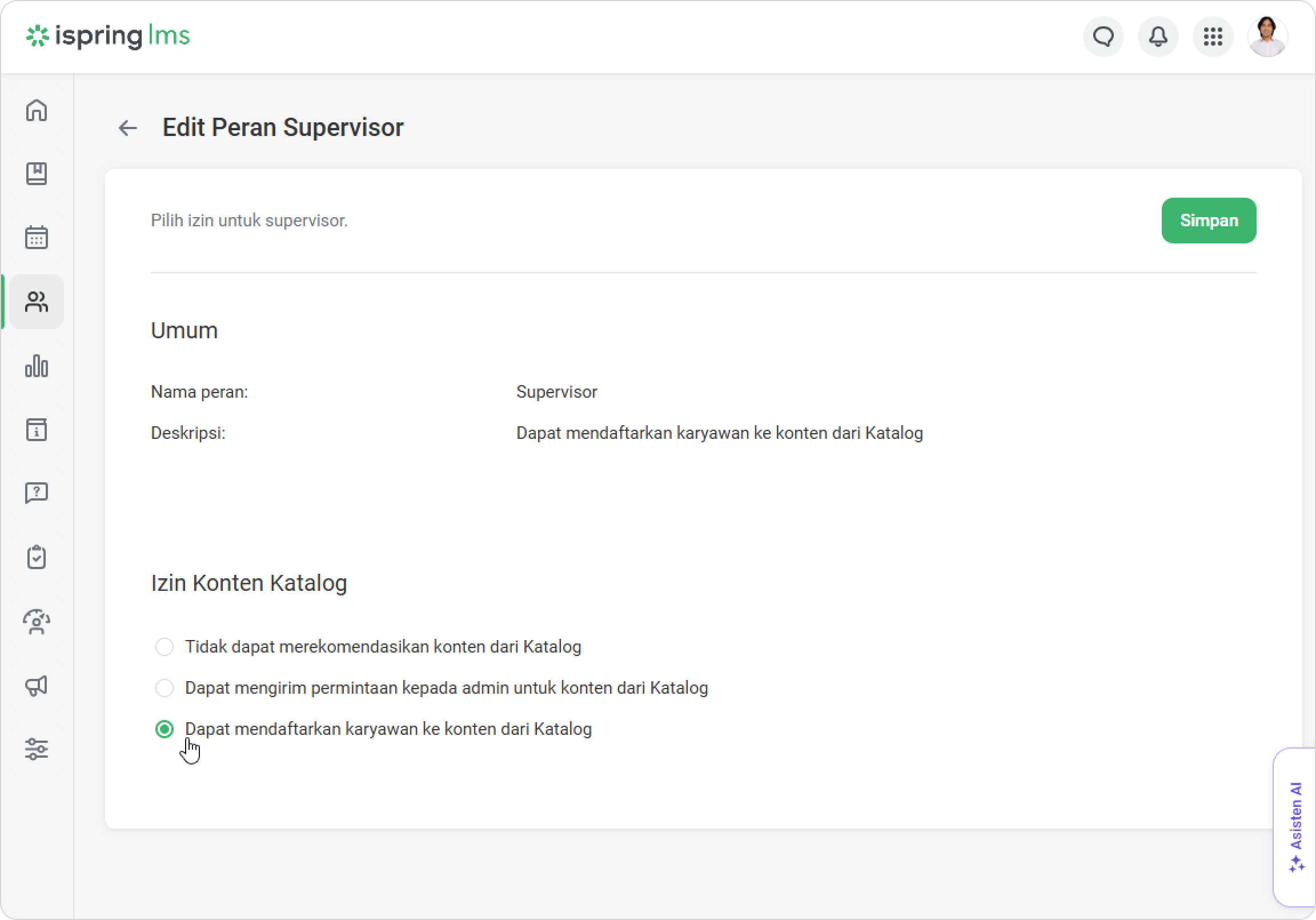 Selamat! Sekarang pengguna dengan peran Supervisor dapat menetapkan pelatihan tanpa perlu persetujuan admin.