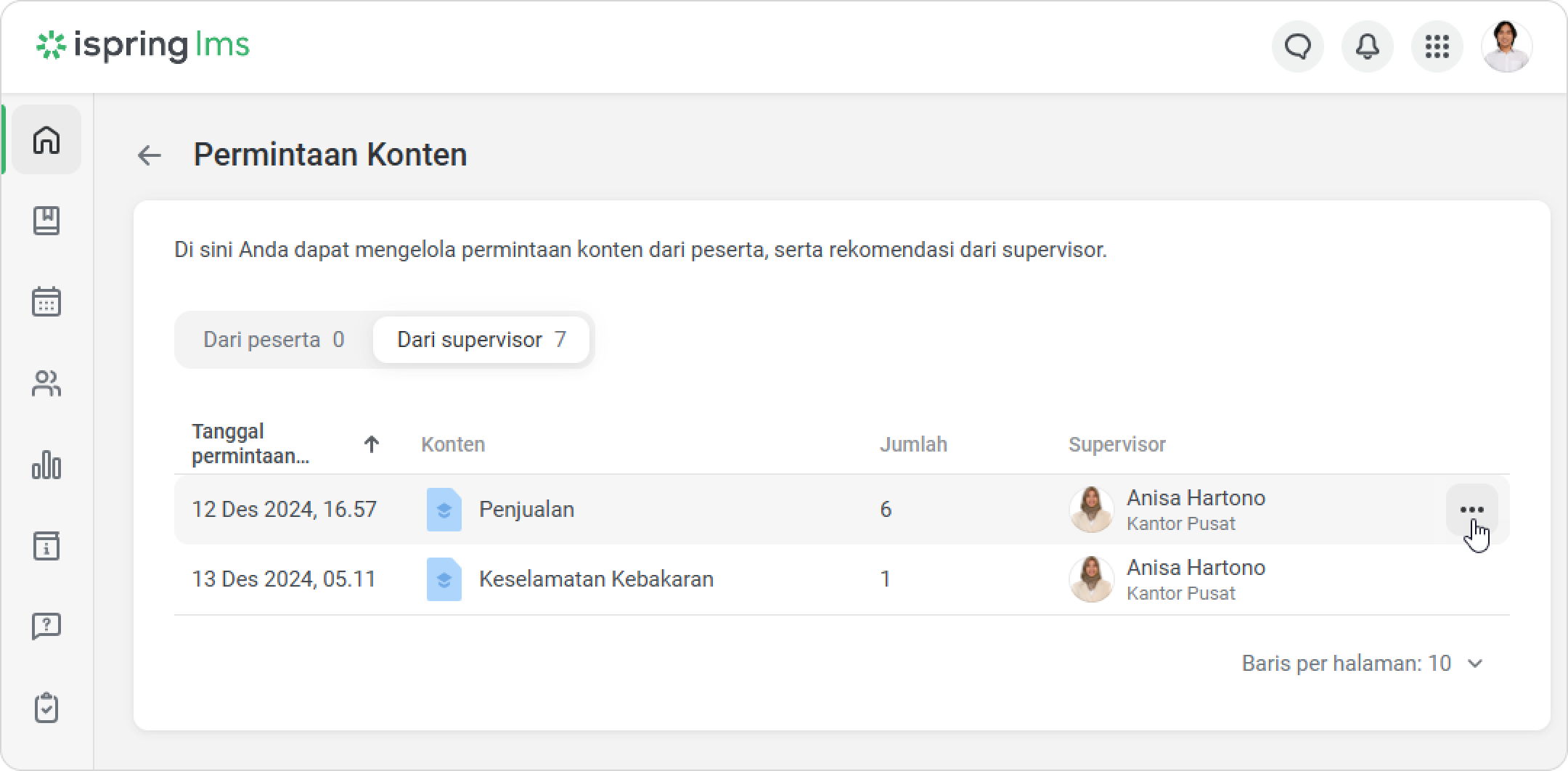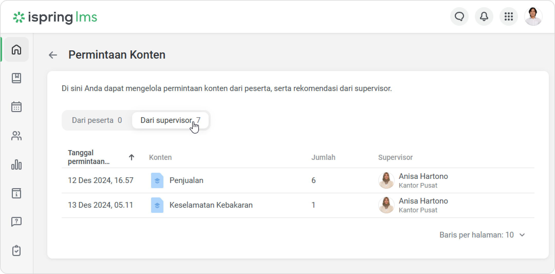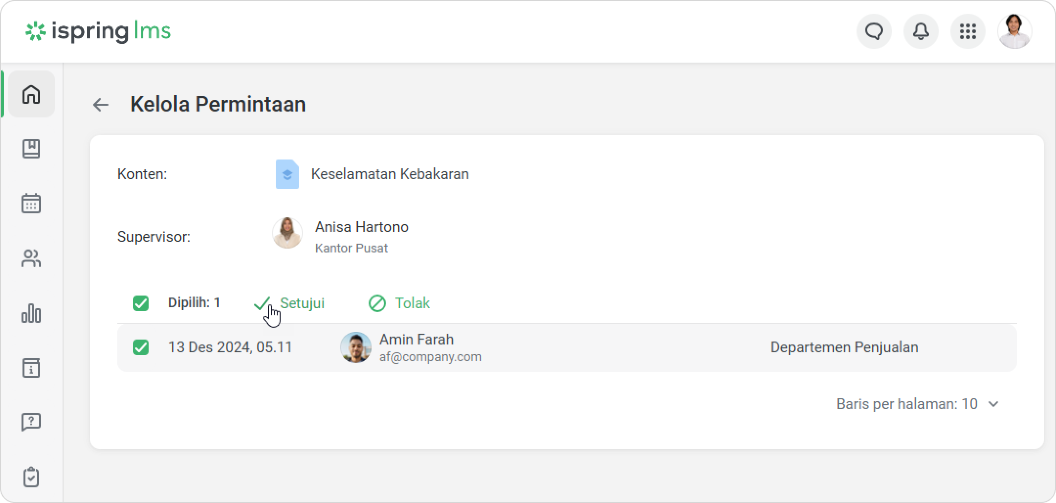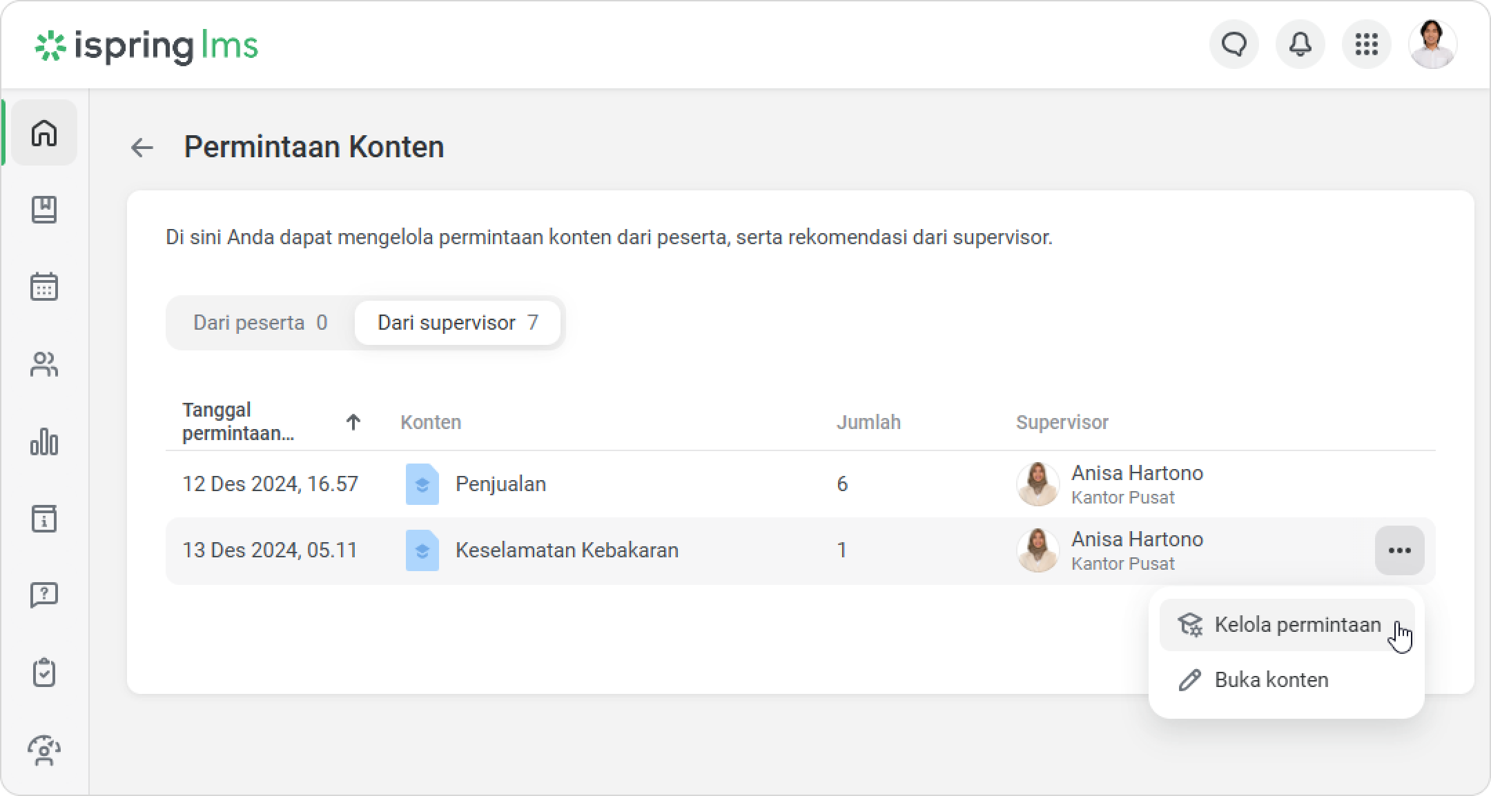 iSpring LMS Tim Saya Rekomendasi dan Permintaan Pelatihan dari Supervisor Current: Cara Menyetujui Permintaan Cara Menyetujui Permintaan Administrator bisa melihat permintaan dari supervisor di dashboard dan di bagian Notifikasi.Untuk menyetujui permintaan:Klik pada notifikasi.Lalu buka tab Dari supervisor.Pilih permintaan dan klik pada menu.Klik Kelola permintaan.Untuk menyetujui permintaan, centang kotak di sebelah karyawan. Lalu klik Setujui.Di jendela Setujui Permintaan, klik Setujui.Selesai! Anda telah menyetujui permintaan supervisor. Supervisor akan menerima notifikasi bahwa permintaan telah disetujui.Karyawan akan menerima notifikasi ketika admin menyetujui permintaan.Kursus yang direkomendasikan juga akan muncul di bagian Kursus Saya, dengan label Direkomendasikan oleh supervisor.Peran Khusus dengan Izin untuk Mengelola PermintaanBuat peran khusus untuk meringankan beban kerja administrator dan mempercepat persetujuan permintaan.Klik Peran > Peran Baru. Anda juga dapat mengedit peran yang sudah ada.Di bagian Manajemen Pembelajaran, centang opsi Kelola permintaan konten dari Katalog.Klik Simpan.Selesai! Sekarang pengguna dengan peran khusus dapat menyetujui pelatihan untuk karyawan. ×