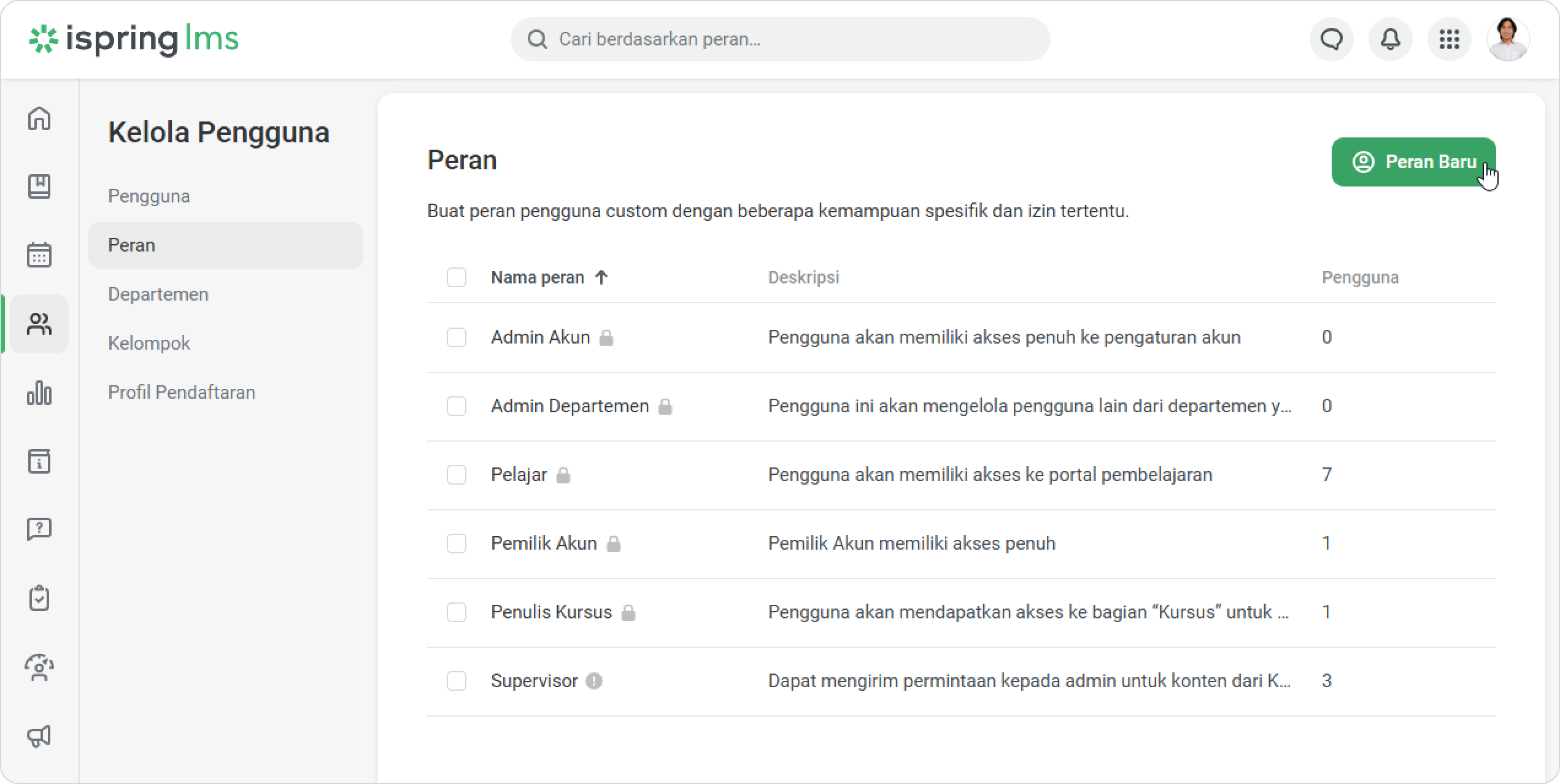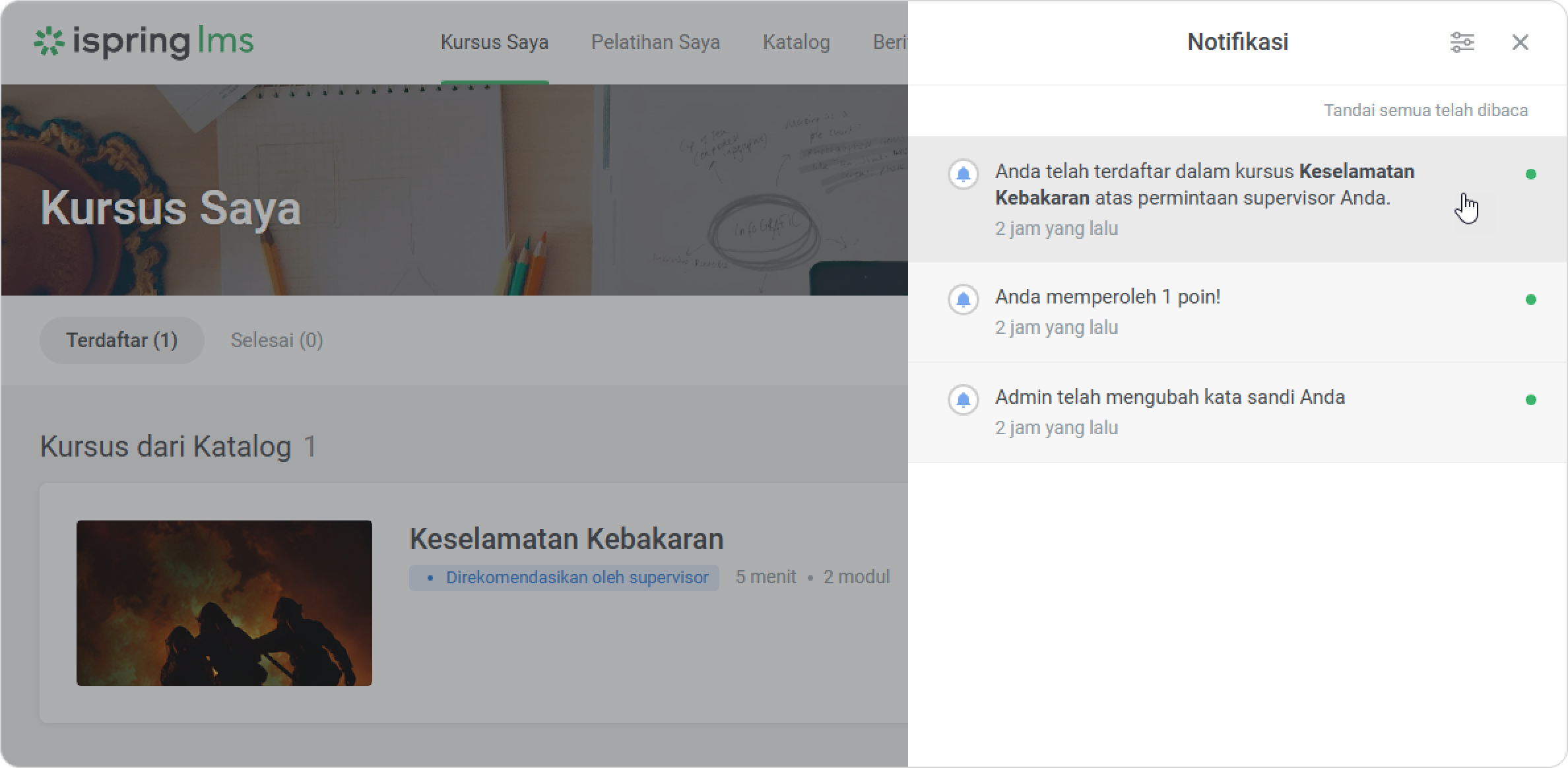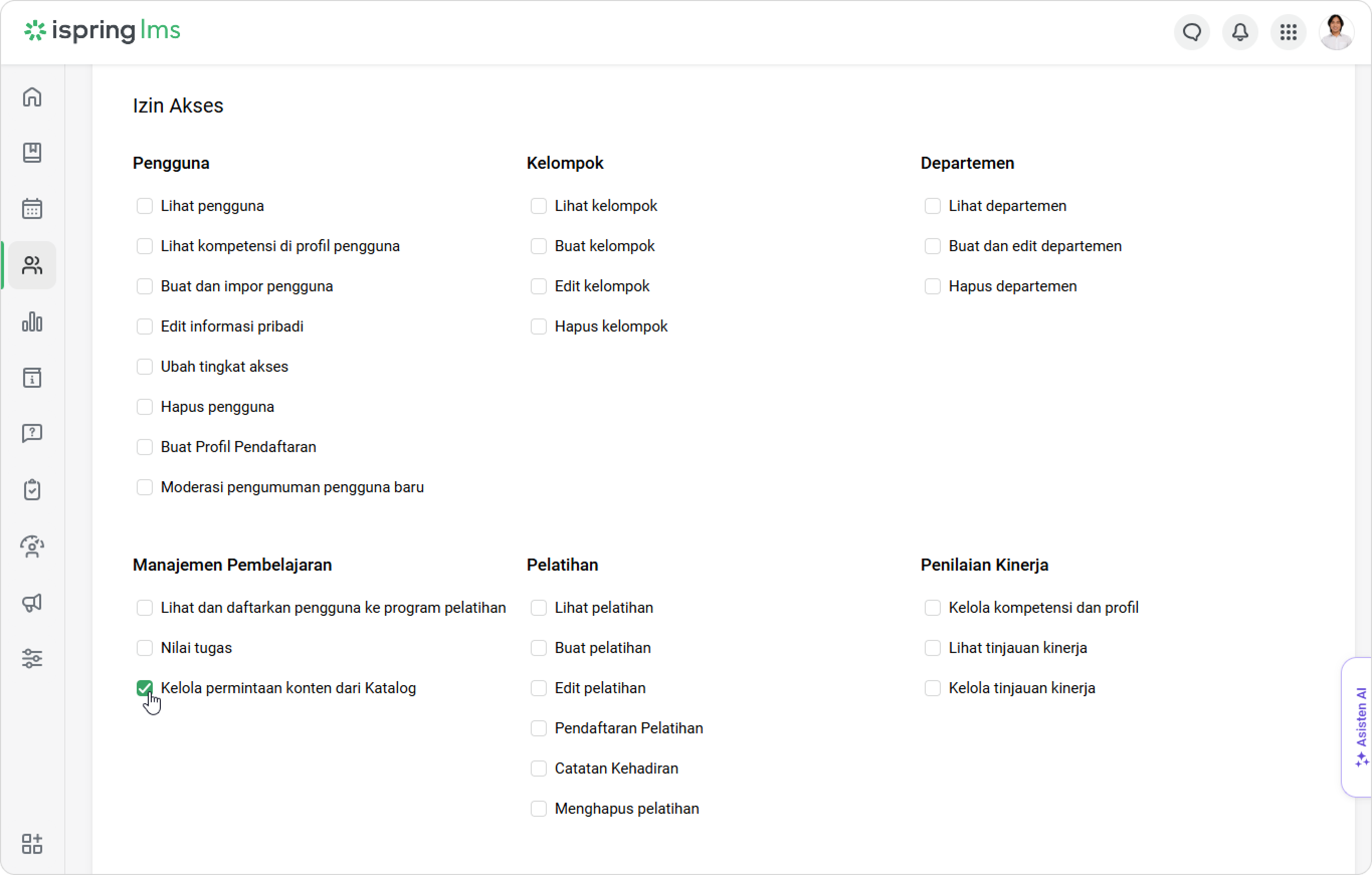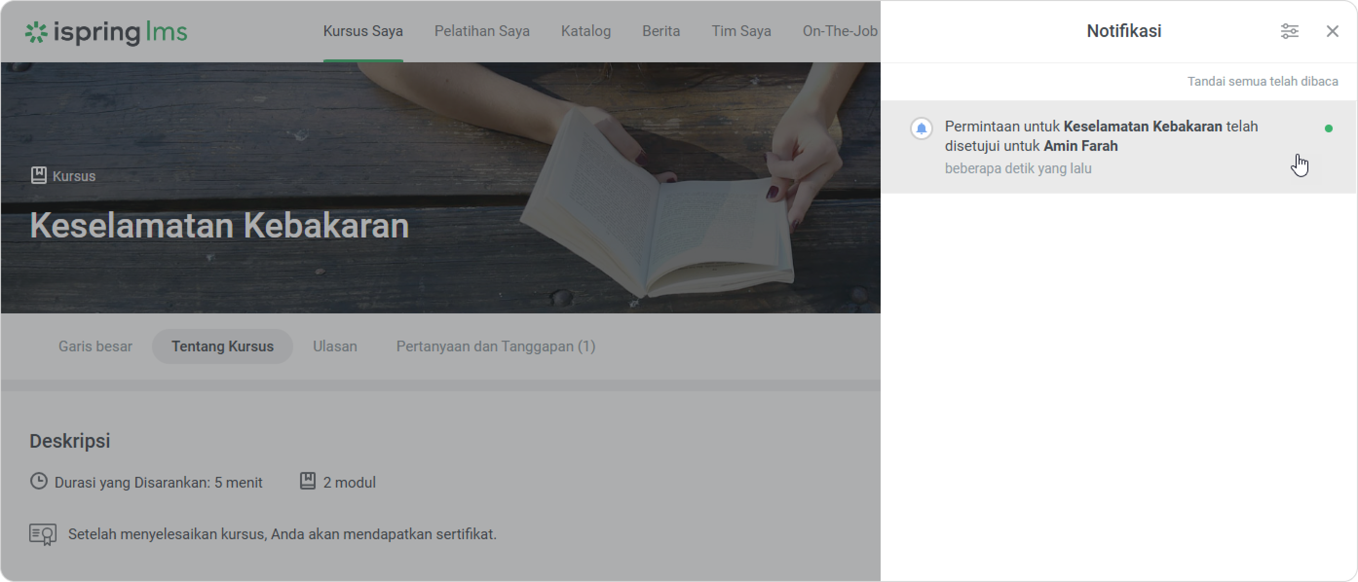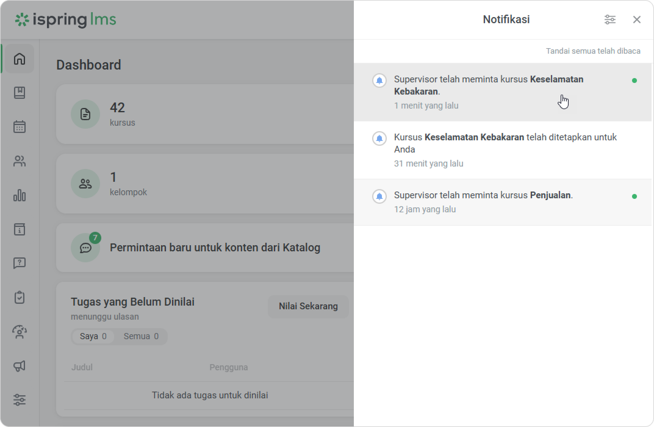 iSpring LMS Tim Saya Rekomendasi dan Permintaan Pelatihan dari Supervisor Current: Cara Menyetujui Permintaan Cara Menyetujui Permintaan Administrator bisa melihat permintaan dari supervisor di dashboard dan di bagian Notifikasi.Untuk menyetujui permintaan:Klik pada notifikasi.Lalu buka tab Dari supervisor.Pilih permintaan dan klik pada menu.Klik Kelola permintaan.Untuk menyetujui permintaan, centang kotak di sebelah karyawan. Lalu klik Setujui.Di jendela Setujui Permintaan, klik Setujui.Selesai! Anda telah menyetujui permintaan supervisor. Supervisor akan menerima notifikasi bahwa permintaan telah disetujui.Karyawan akan menerima notifikasi ketika admin menyetujui permintaan.Kursus yang direkomendasikan juga akan muncul di bagian Kursus Saya, dengan label Direkomendasikan oleh supervisor.Peran Khusus dengan Izin untuk Mengelola PermintaanBuat peran khusus untuk meringankan beban kerja administrator dan mempercepat persetujuan permintaan.Klik Peran > Peran Baru. Anda juga dapat mengedit peran yang sudah ada.Di bagian Manajemen Pembelajaran, centang opsi Kelola permintaan konten dari Katalog.Klik Simpan.Selesai! Sekarang pengguna dengan peran khusus dapat menyetujui pelatihan untuk karyawan. ×