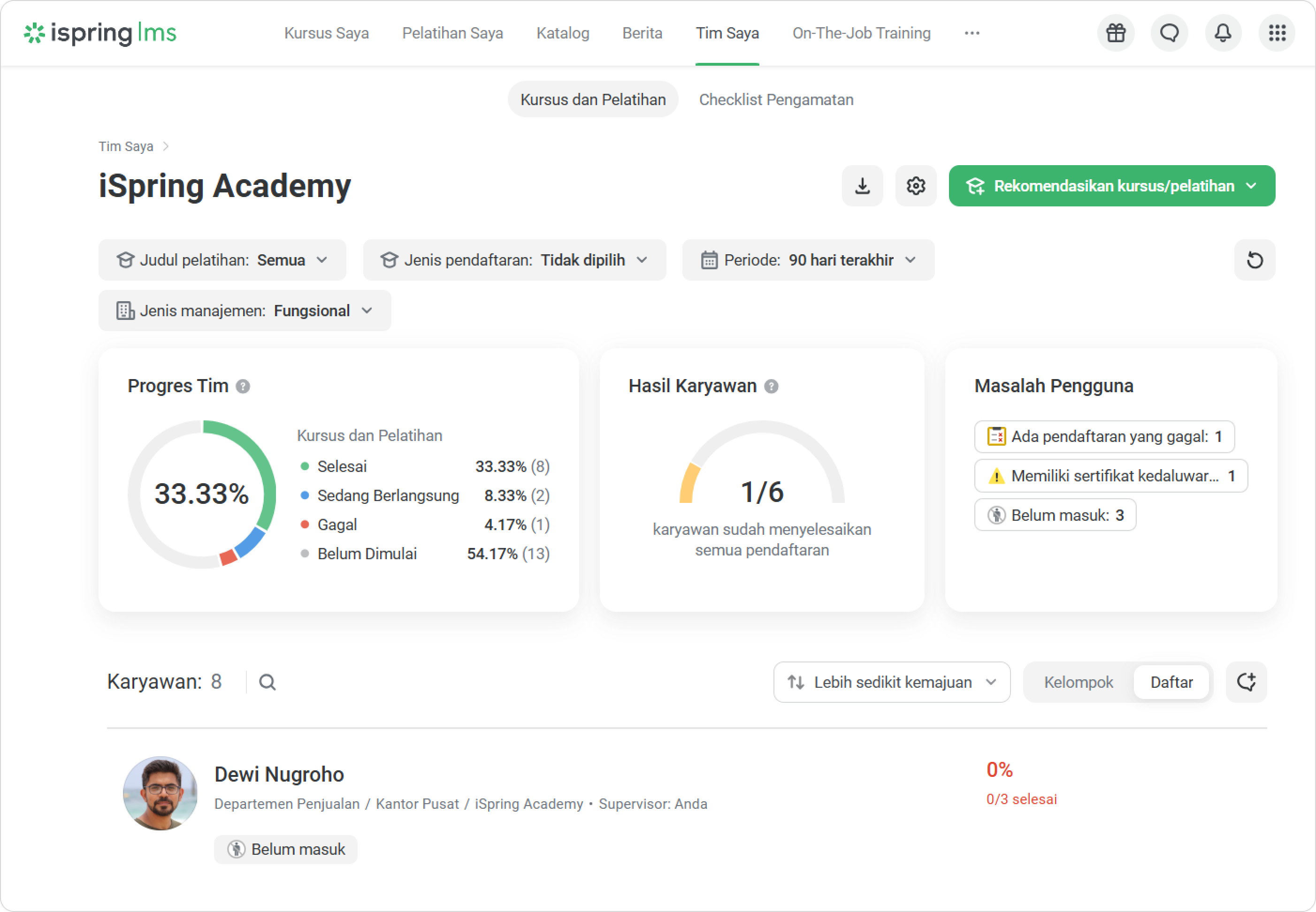 Dashboard menunjukkan berapa banyak karyawan yang telah menyelesaikan program pelatihan, dan berapa banyak yang belum memulainya. Supervisor akan diberi tahu tepat waktu untuk menindaklanjuti.