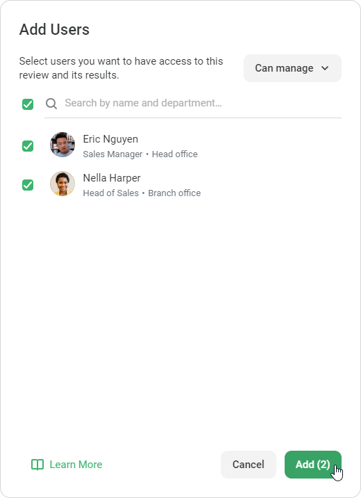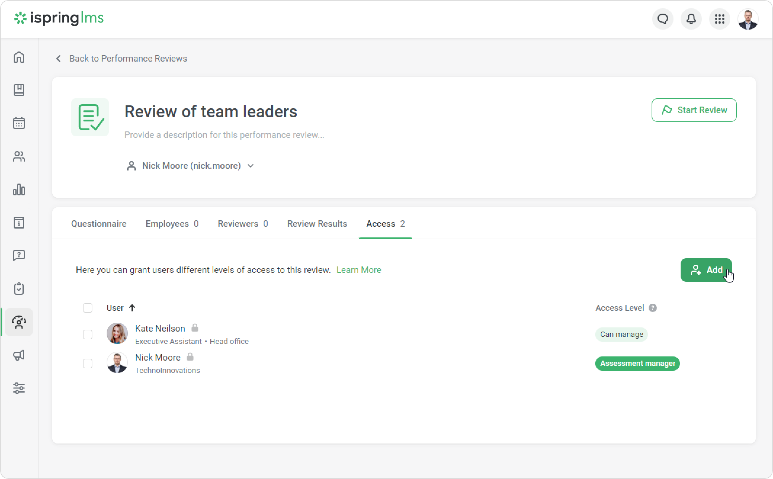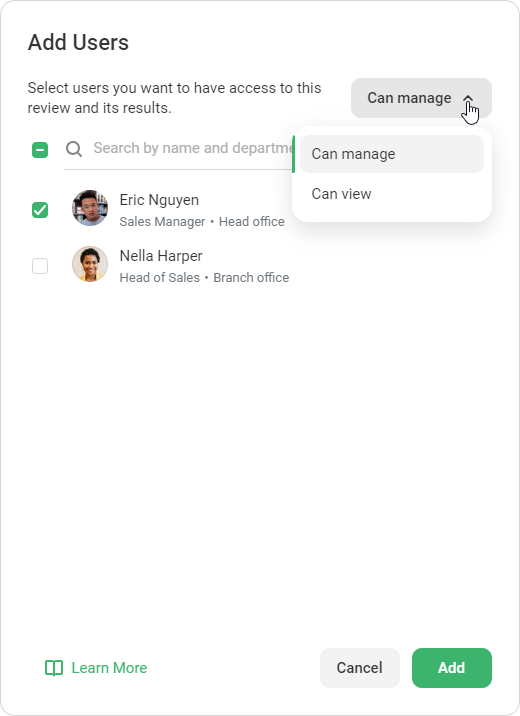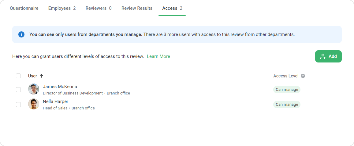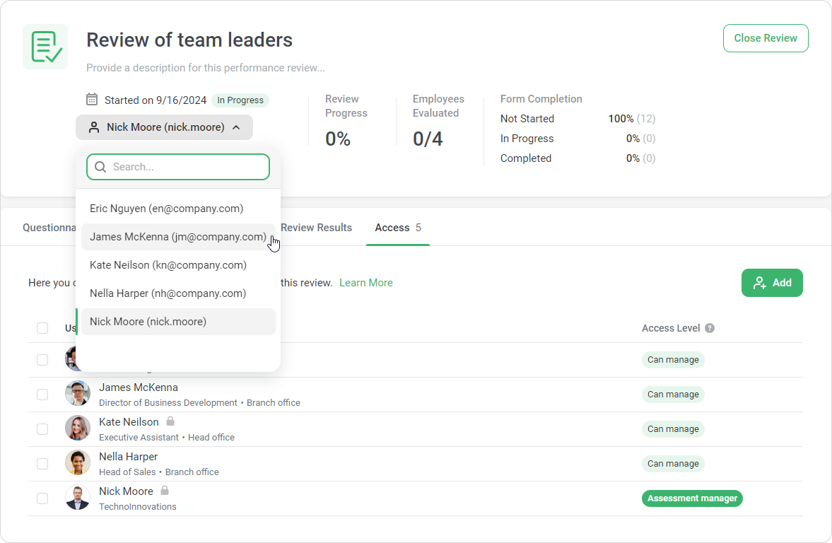 The Account Owner and Account Administrators have access to and can manage all Performance Reviews by default.