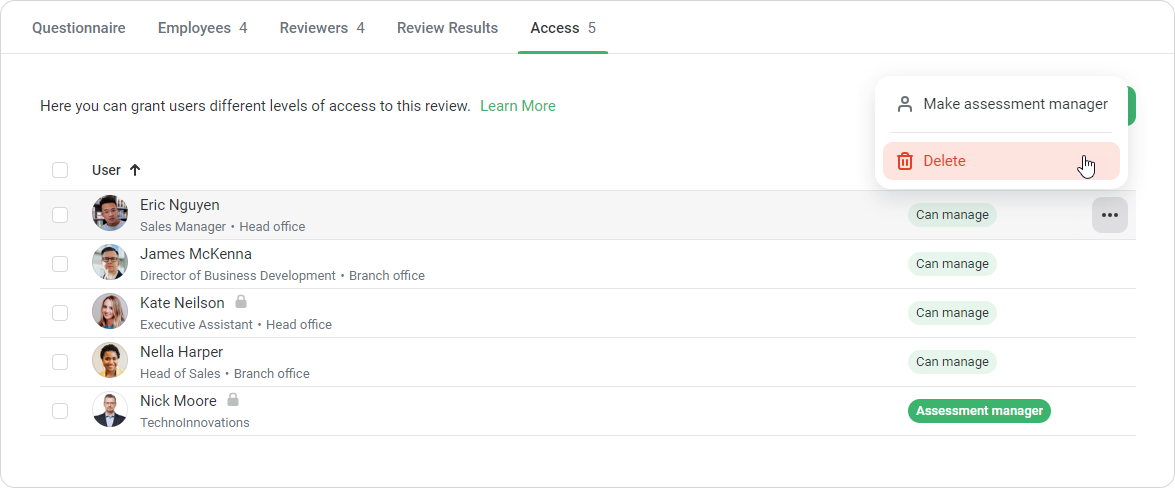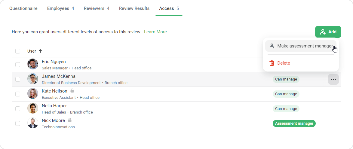 Or click on next to the user's name and select Make assessment manager.