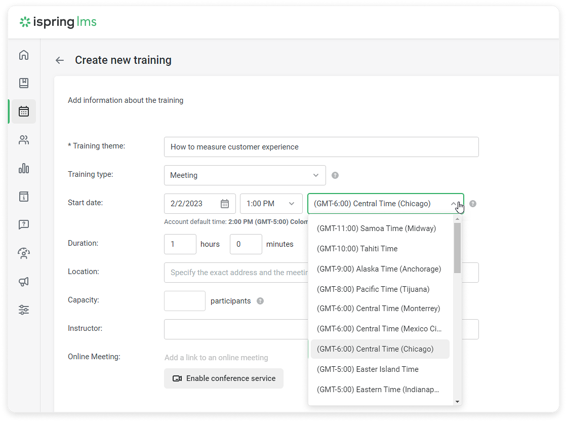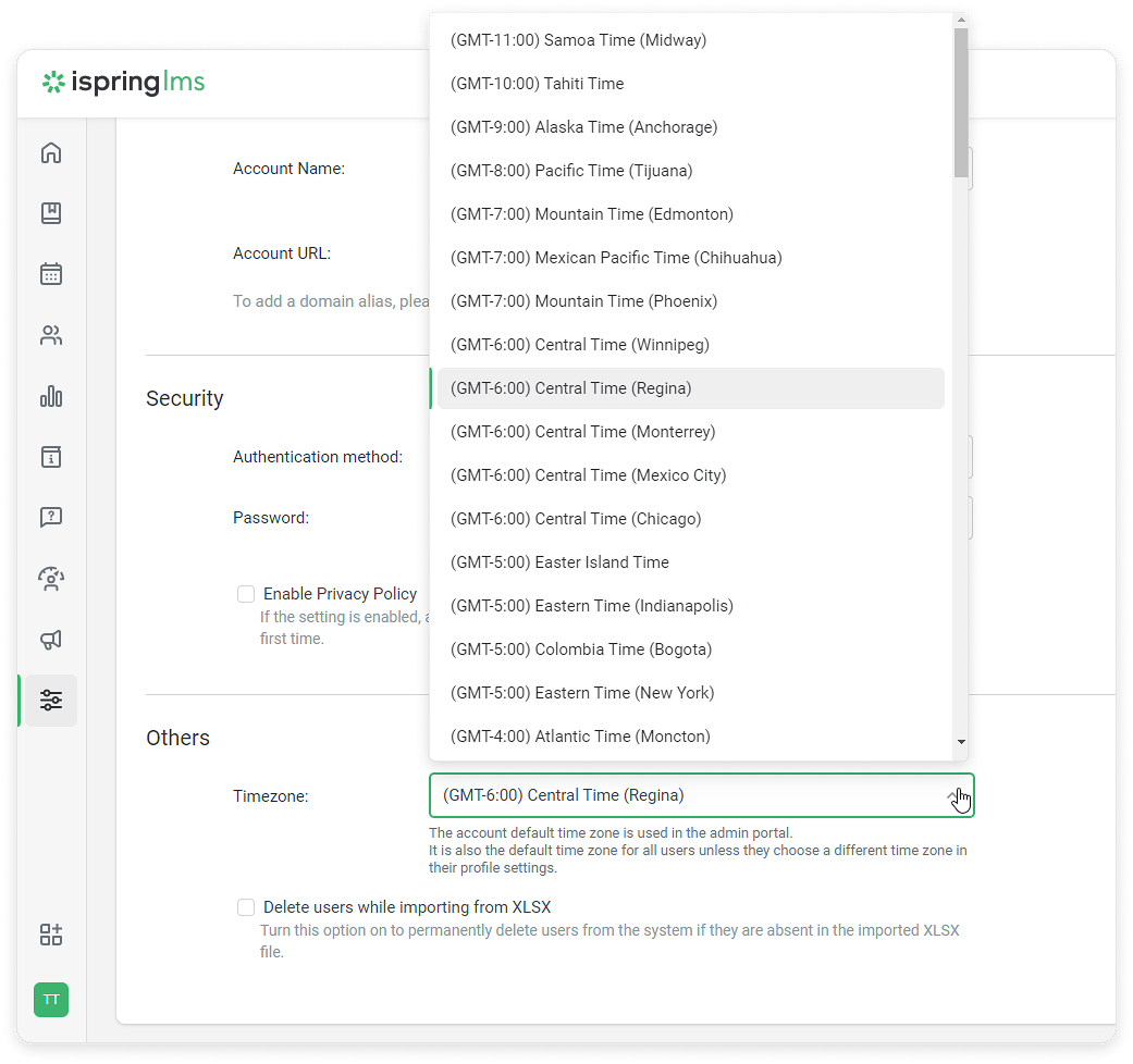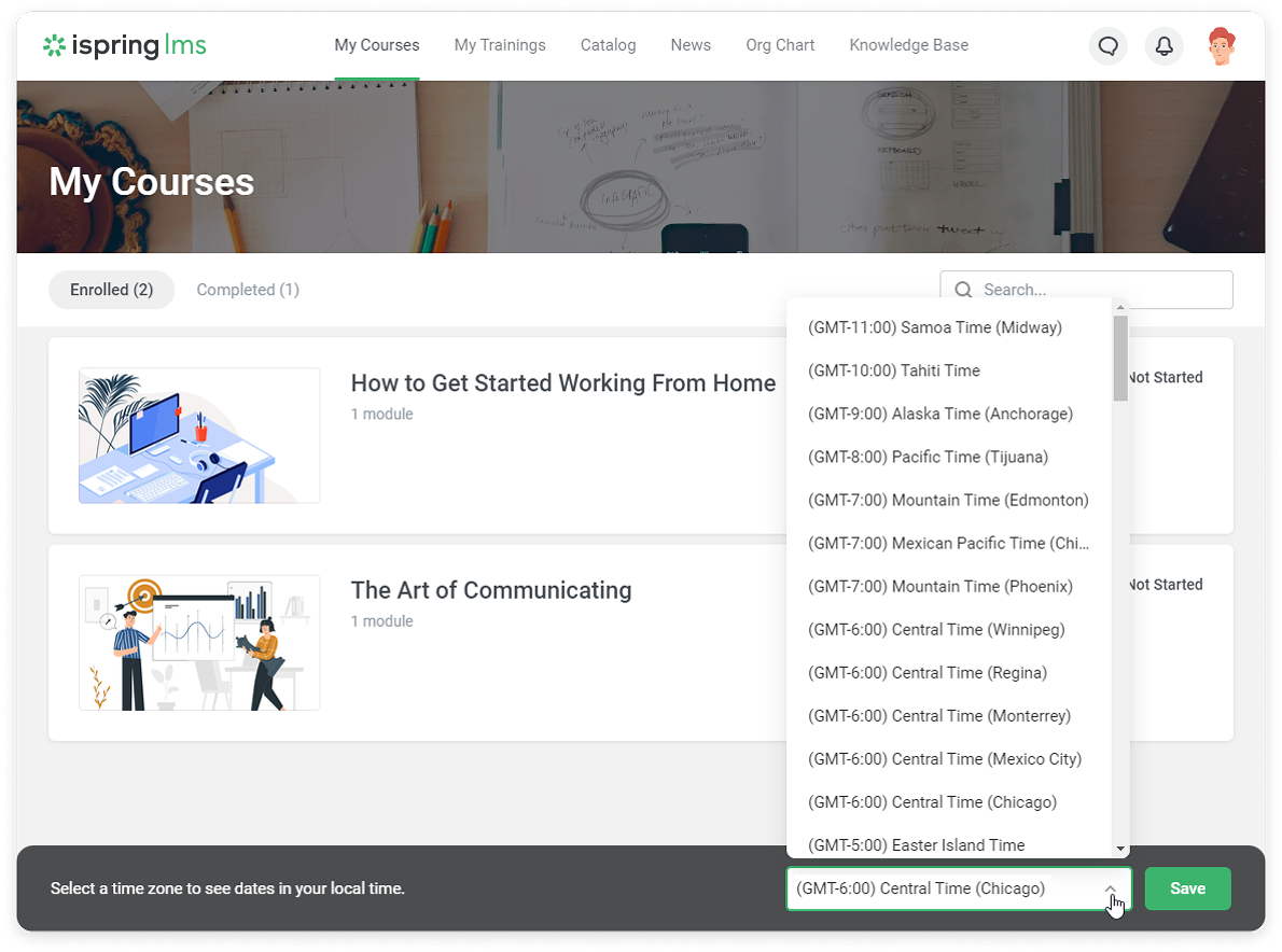 Users and admin can select their own separate time zones in their iSpring LMS accounts.