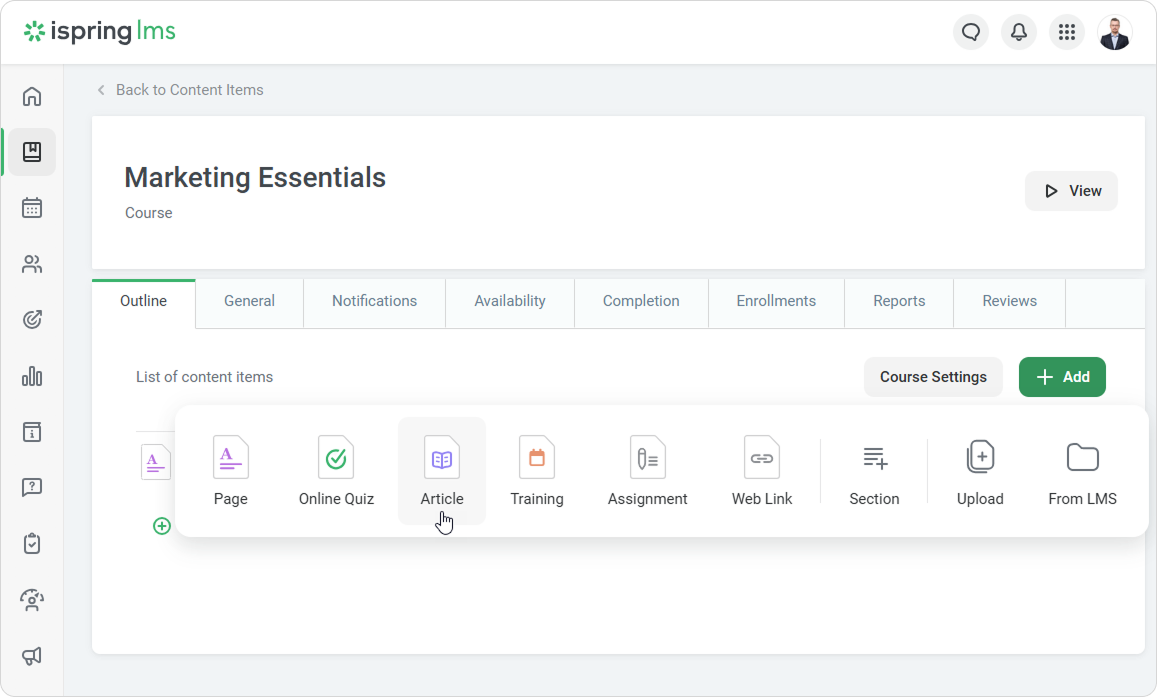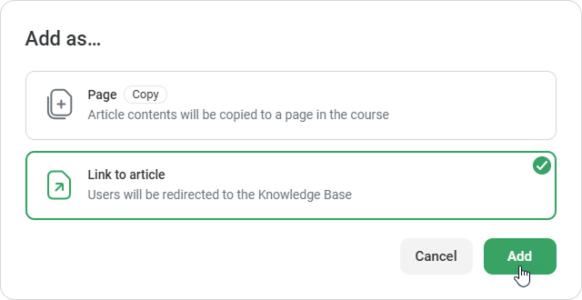 You can add a Knowledge Base article to a course in the Learning Content section or in the Knowledge Base.