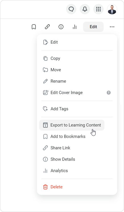 In the upper-right corner, click on ••• and selectExport to Learning Content.