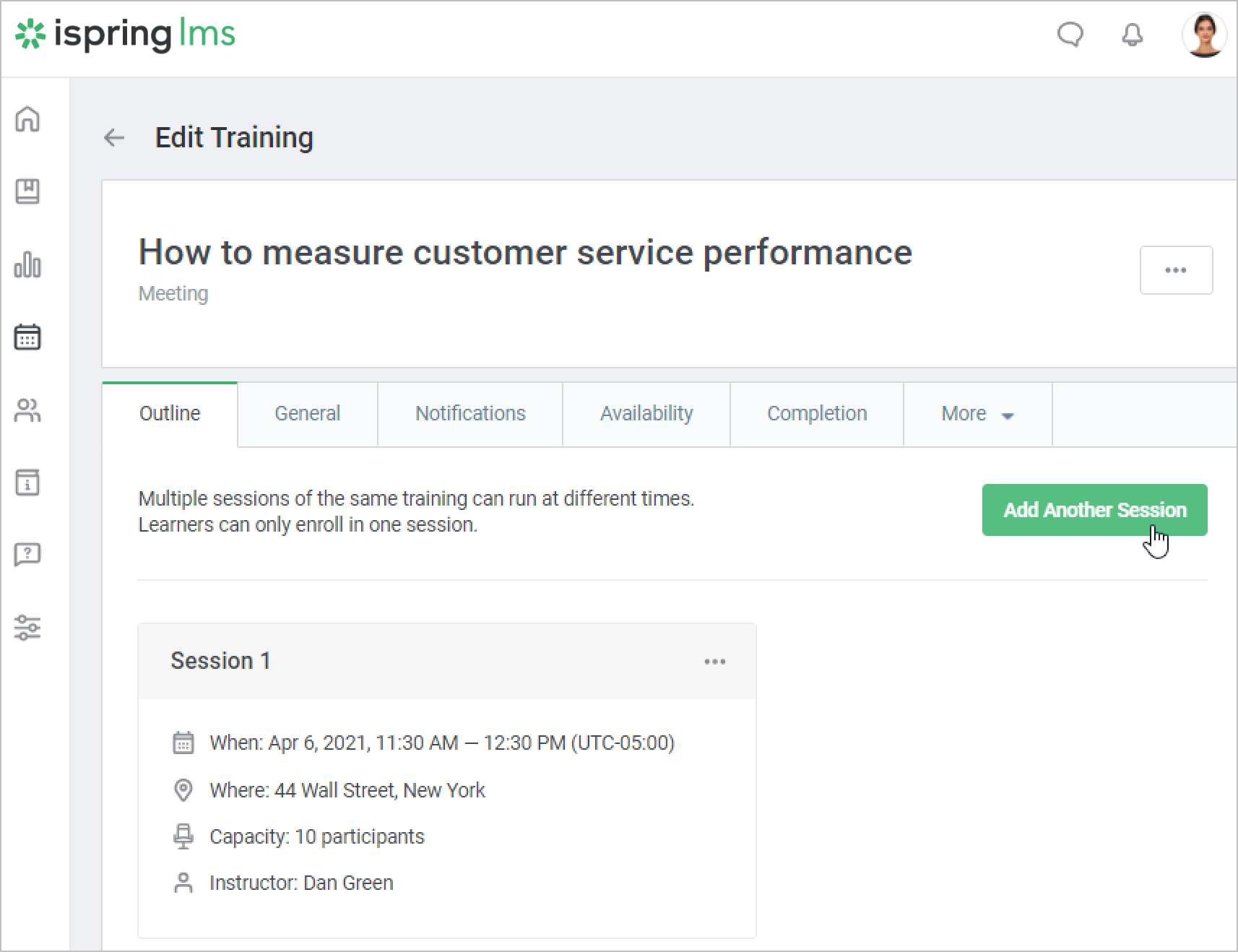 For example, create two sessions for the Negotiations Techniques training. They will take place at different times: the first session — on Monday morning, the second one — on Thursday evening. The contents of both sessions will be absolutely the same. In this way, all employees will be able to attend the training in spite working different shifts.