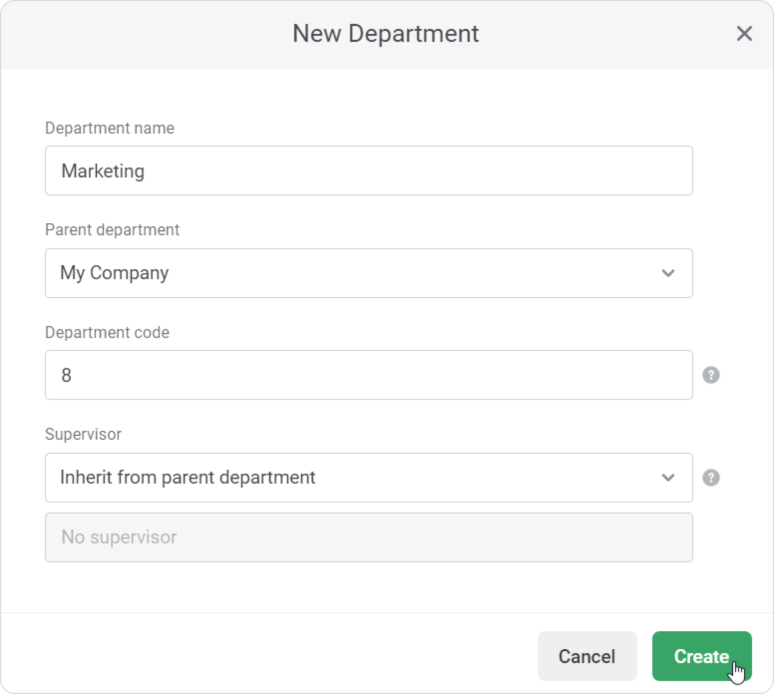 In the Edit Department window, enter the department title and code, choose a new parent department and assign a supervisor. To apply changes, click Save.
