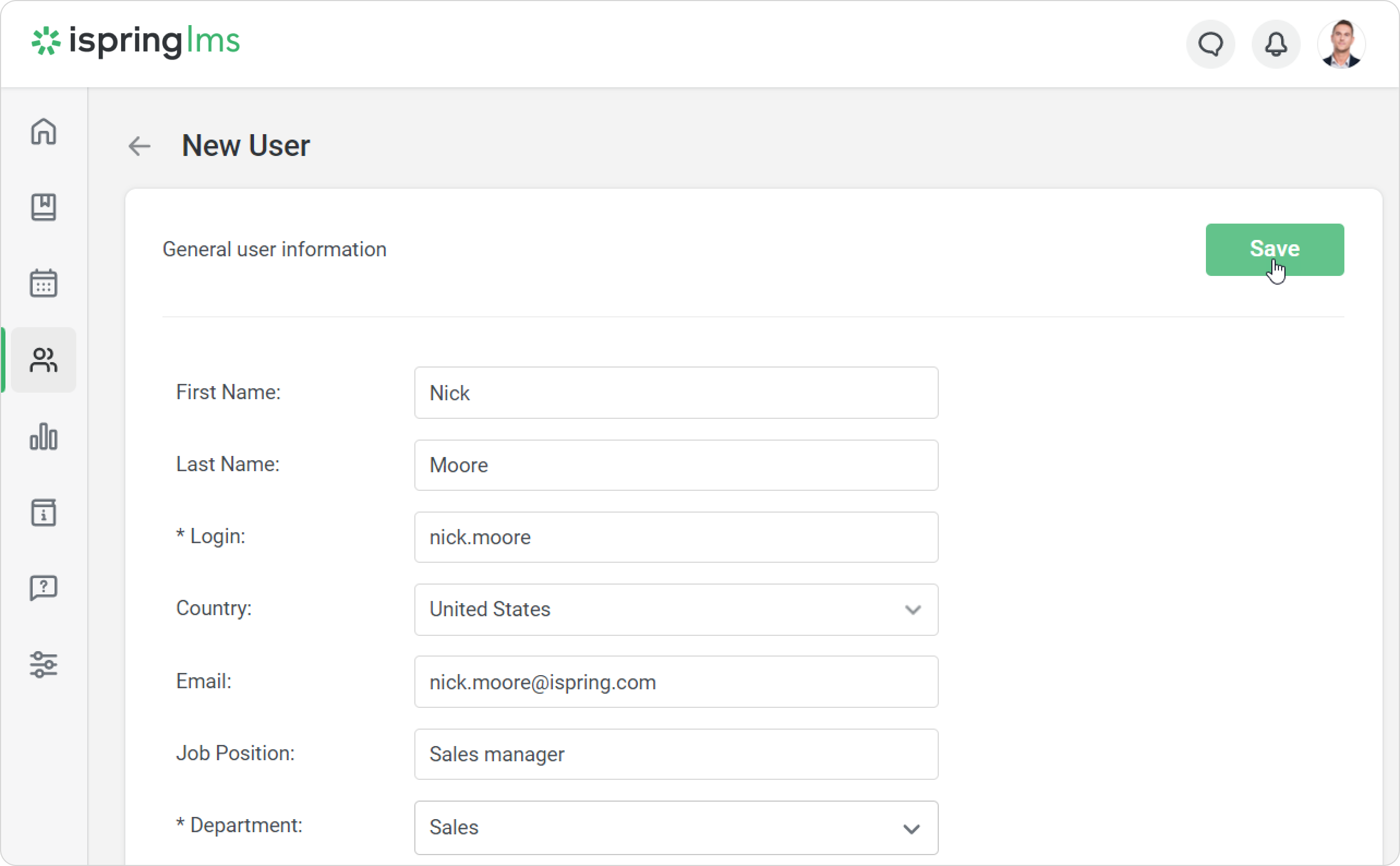 - Tick Notify a user by email that their learning portal was created if you want to send them an email with credentials to log in to their iSpring LMS account.