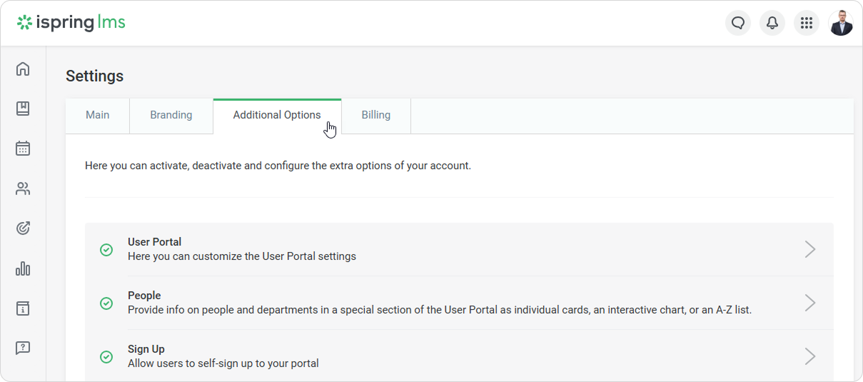 iSpring LMS Settings Current: Additional Options Additional Options Go to the Settings section and open the Additional Options tab.The following options are available here: ×