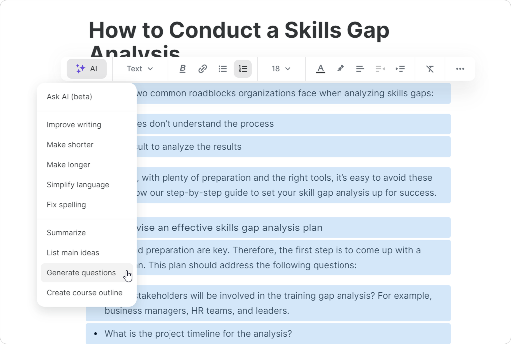 - Highlight the text you want to generate questions for and click on AI > Generate questions.
