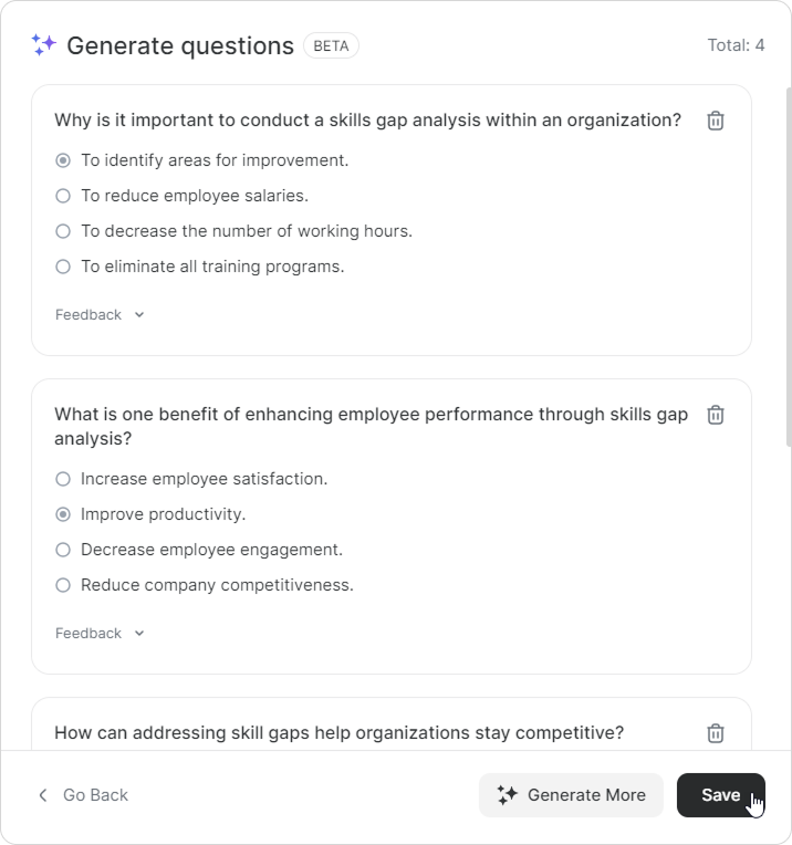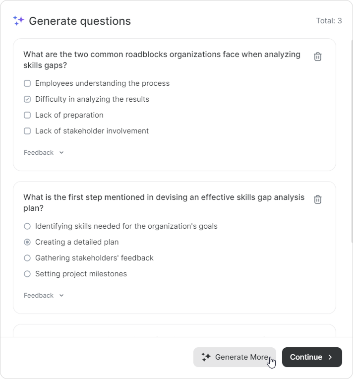 iSpring AI will suggest single choice and multiple response type questions. If you need more questions, click on Generate More, and new questions will be added to the existing ones.