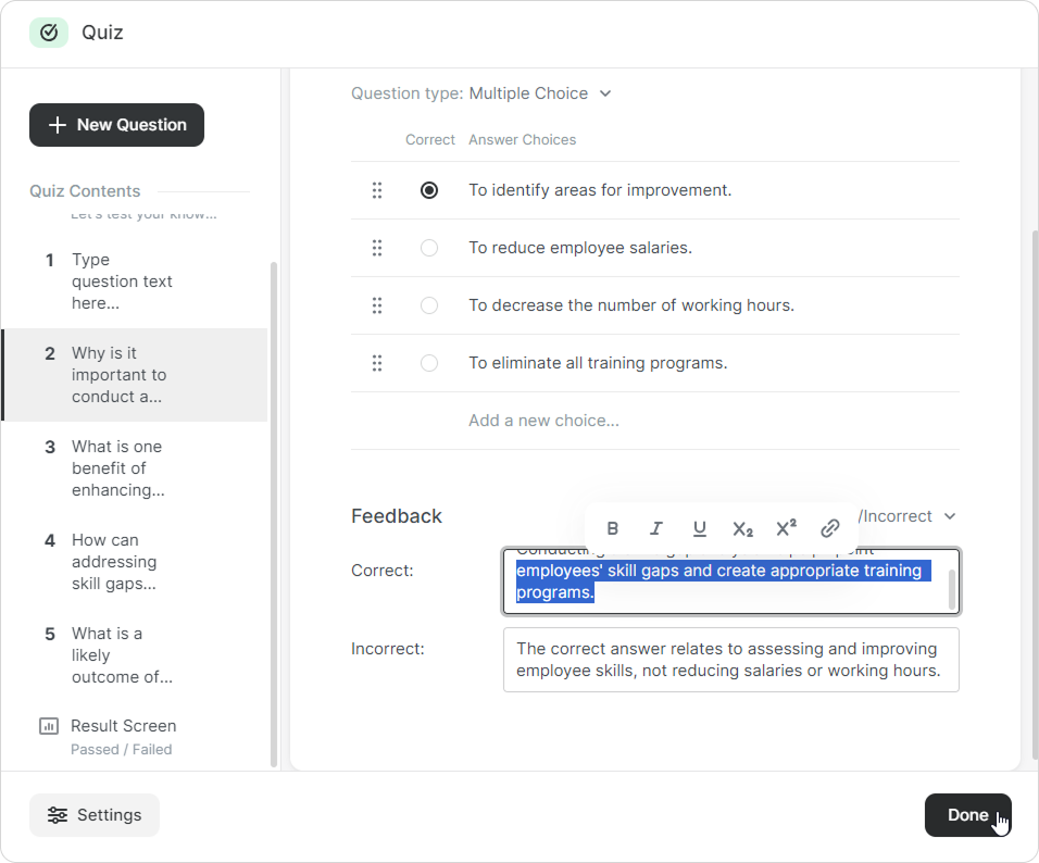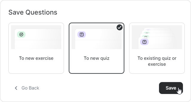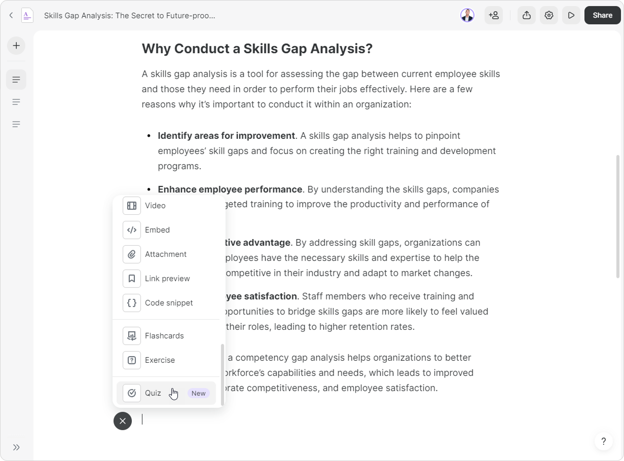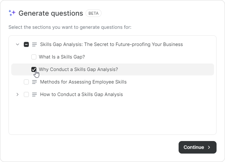 You can add AI generated quizzes to your pages. This means you can highlight text, select a chapter or a portion of it, or even an entire page, and AI will automatically create relevant questions. This saves a lot of time spent on course creation and allows Course Authors without strong instructional design skills to create quizzes.