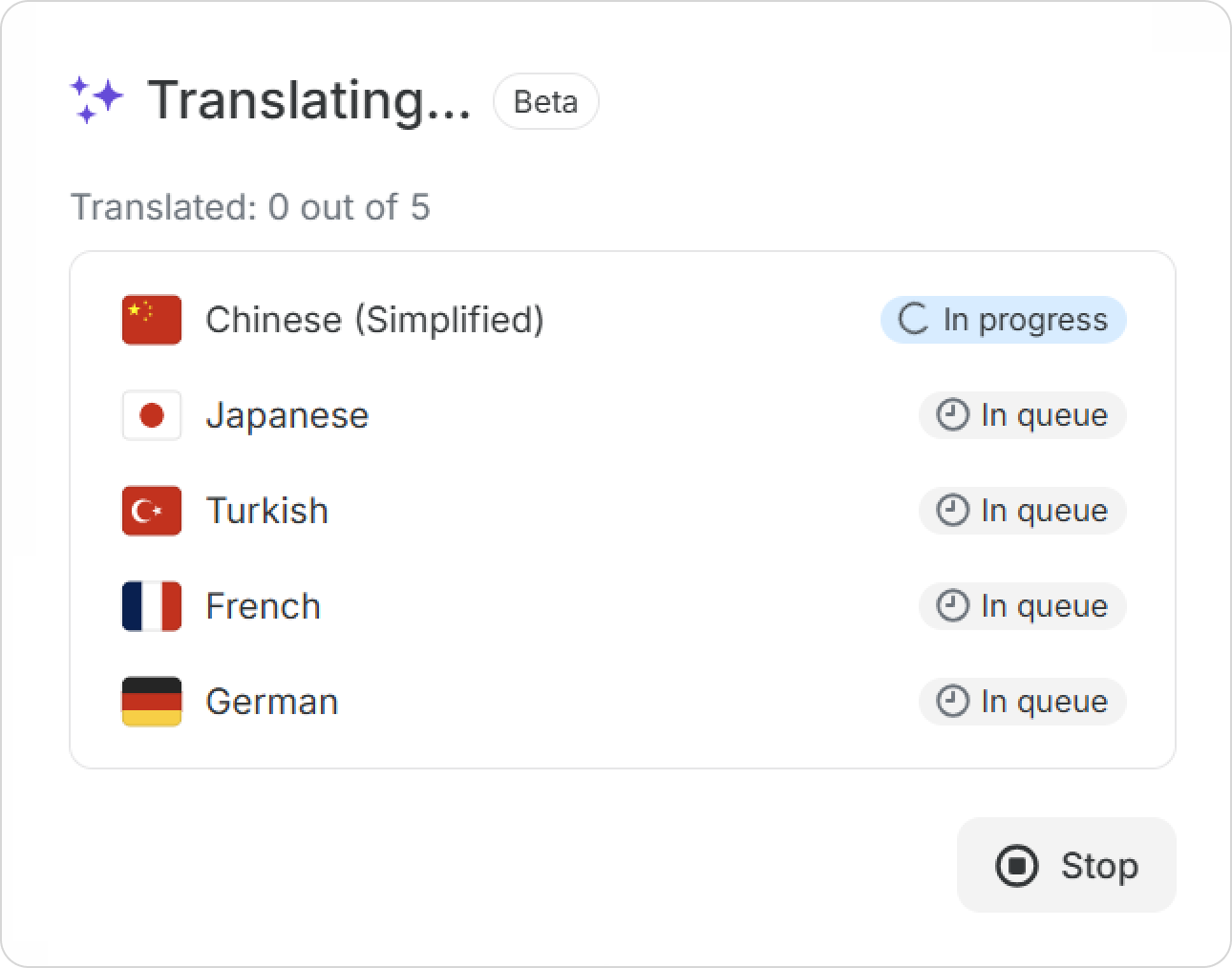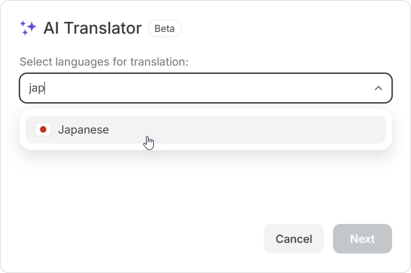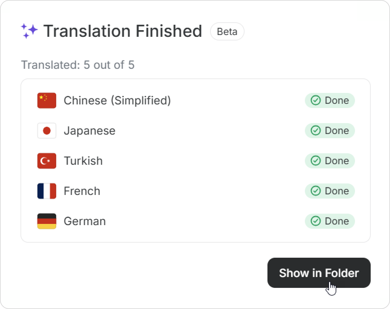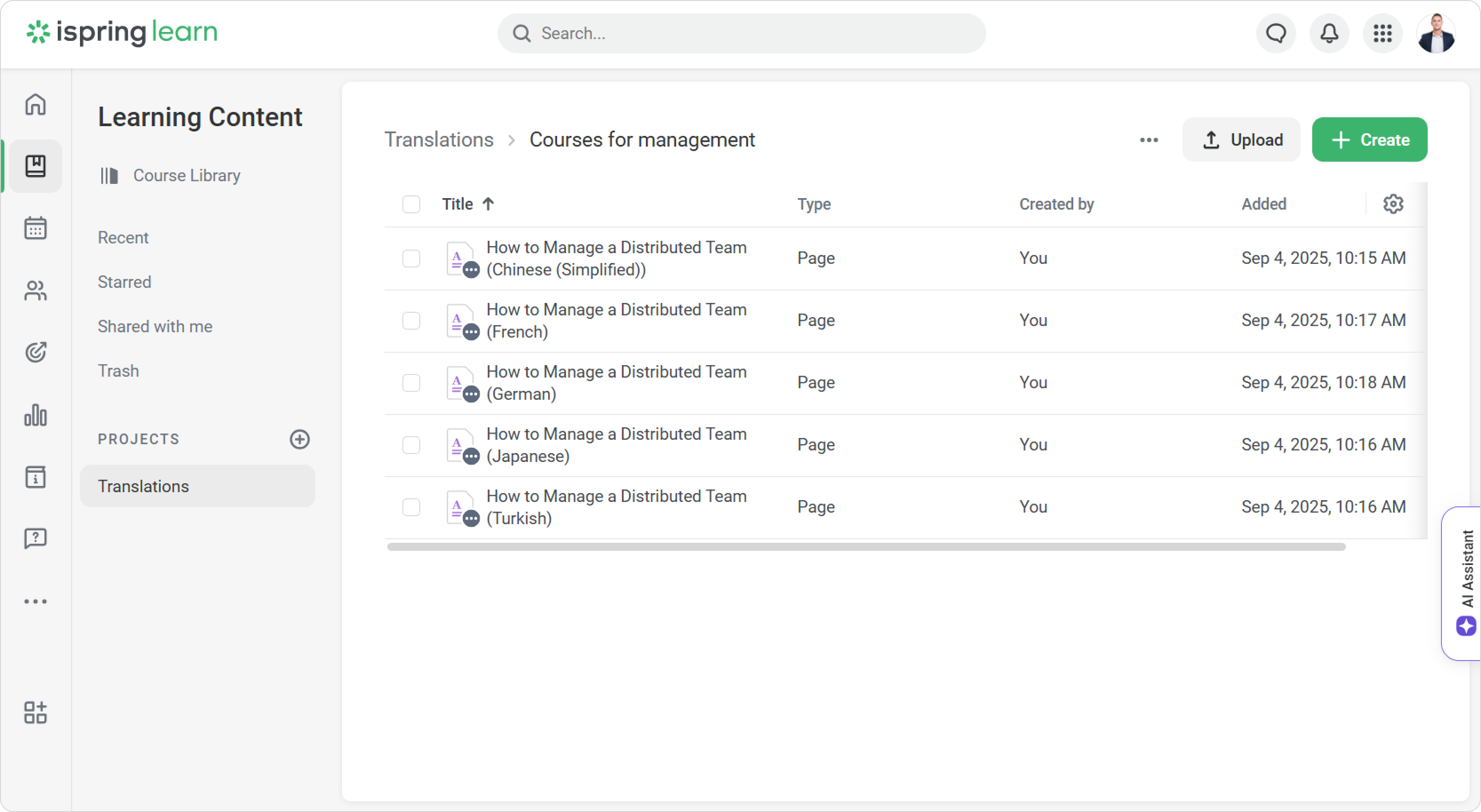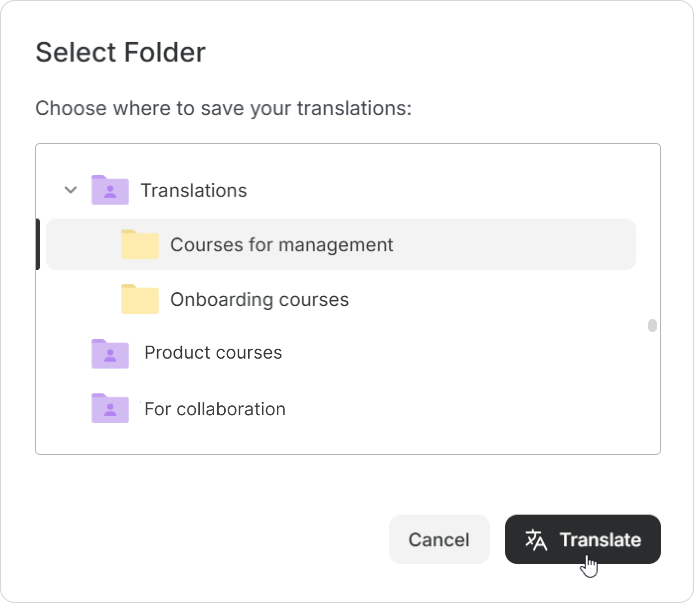 iSpring Learn Learning Content Courses Pages Current: AI Translator AI Translator Translate courses into 70+ languages instantly. Just check the draft, make quick edits, and roll out the course worldwide. The AI translator is not available in the trial version.There are 77 languages and their regional variants. For example, you can choose Spanish for Spain or Mexico.Only users with editing rights can run translations.Translations are powered by ChatGPT 5 Mini. How to translate a page to another languageYou can translate the entire page, except images and code snippets. The finished course will look exactly the same — but in another language.Open a page and click on AI Translator. Enter the name of the language or select one from the drop-down list. You can select up to 5 languages at a time. After choosing the languages, click on Next. Select a folder for the translations. Otherwise, the files will be saved in the original folder by default. Then click on Translate.Wait for the translation to complete. To stop the process, click on Stop.You can click on Stop during translation, or after some files are ready. Unfinished translations will not be saved.When the translation is complete, click on Show in Folder to view the files.The folder with all translations will open. Each copy shows the original name and the translation language.All set! You can now share the translation with colleagues or assign it to employees. ×