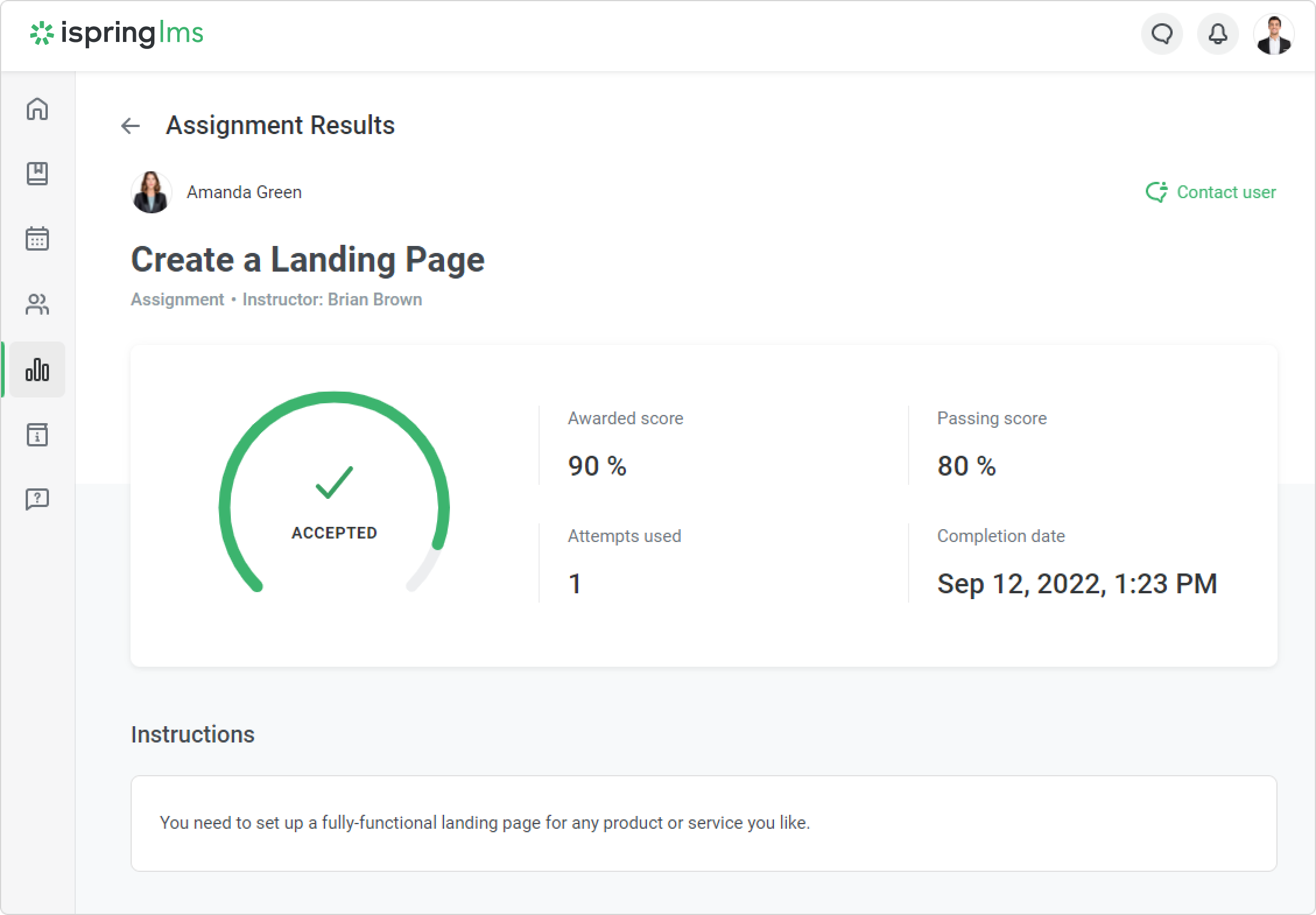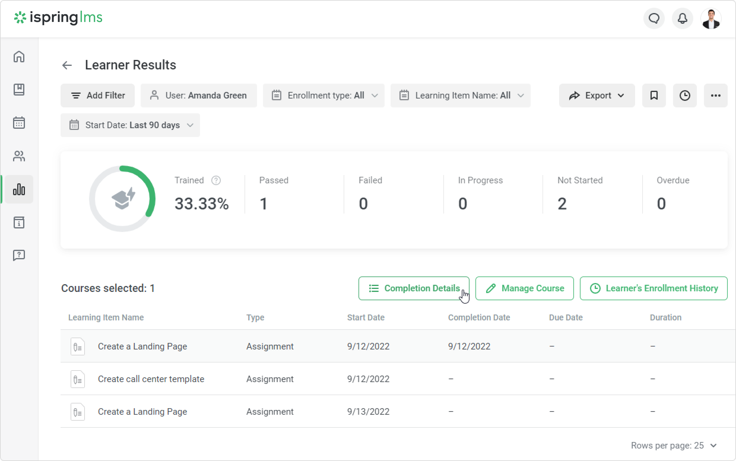 - If you cancel an enrollment that has already been passed and re-assign the assignment to the learner, the report will only contain the details of the latter enrollment.