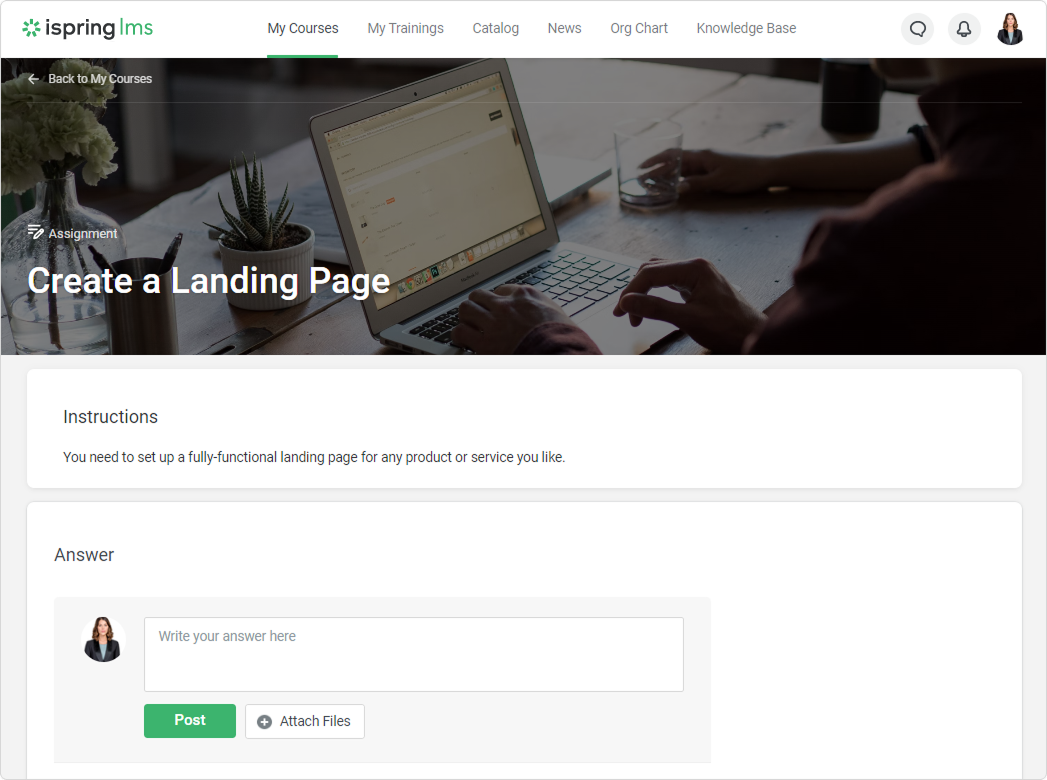 With the Assignments feature, you give your learners freeform tasks as homework. For instance, you can ask learners to compose a reply to a customer's email, create a product presentation, make a project implementation plan, or build a landing page.