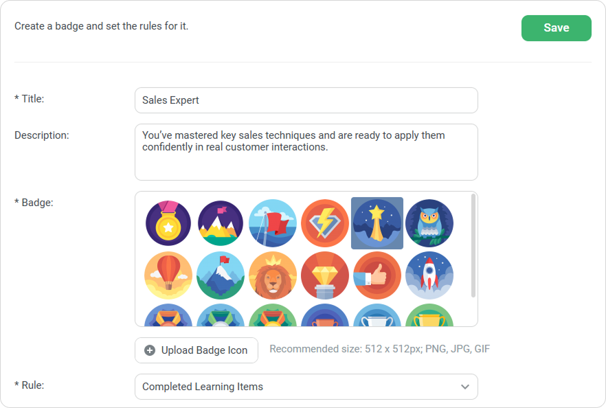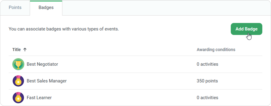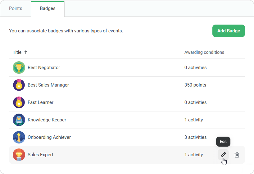 You can reward users with digital badges for earning points and completing educational milestones, such as quizzes, courses, learning tracks, and trainings. For example, you can award a badge for every 100 points earned or assign the title of Best Negotiator after completing a course on cold-calling techniques.