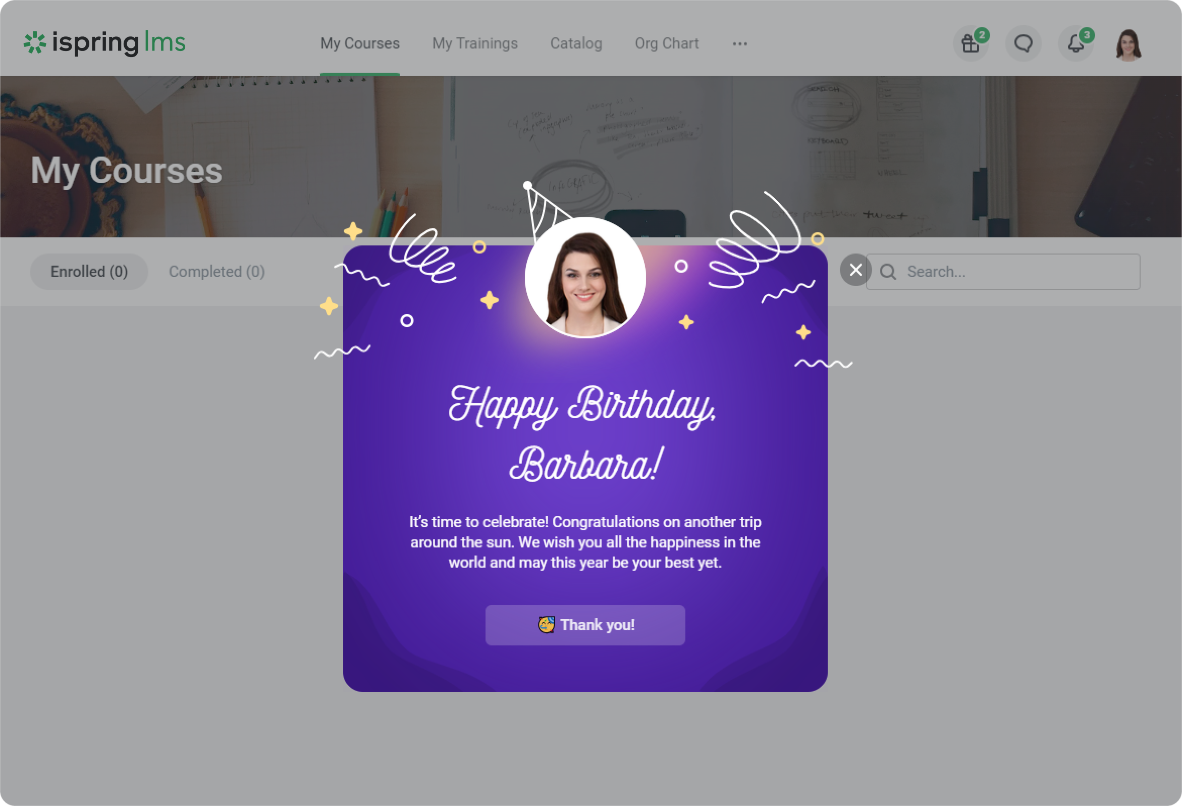 iSpring LMS Settings Additional Options Current: Birthdays Birthdays A new widget will inform users of their colleagues' birthdays so they can wish them a happy day. Team members will see a birthday card with well-wishes on their birthday! How to Add a Birthday Field How to Enable the Birthdays Section Enhanced Birthday Privacy Control How to Enable Birthdays in the Org Chart How to View the List of Birthdays How to Customize Card Design How to Set Up Birthday Announcements ×
