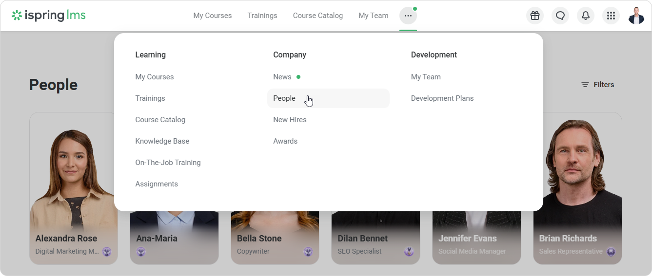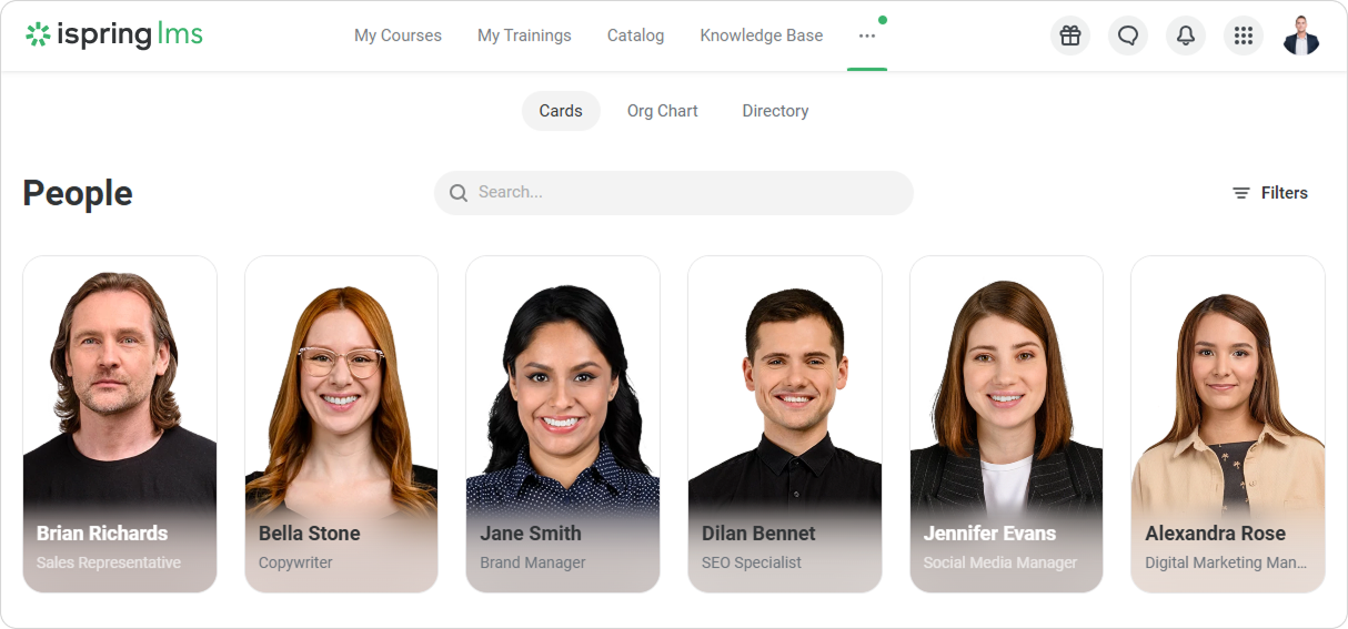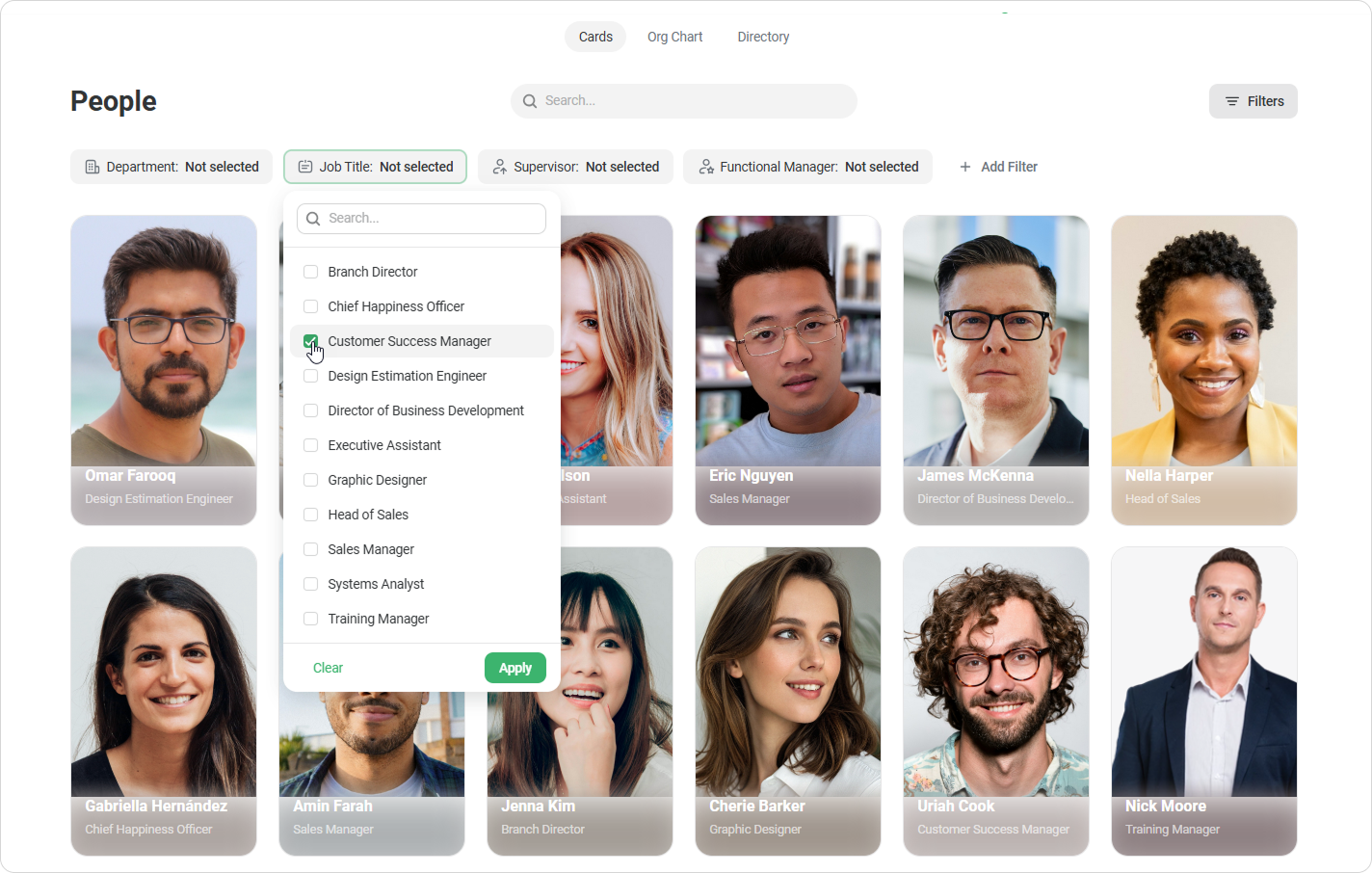 Use the search bar to find an employee by name or other data. Or apply filters to see specific employees, such as employees with the “Customer Success Manager” job title.