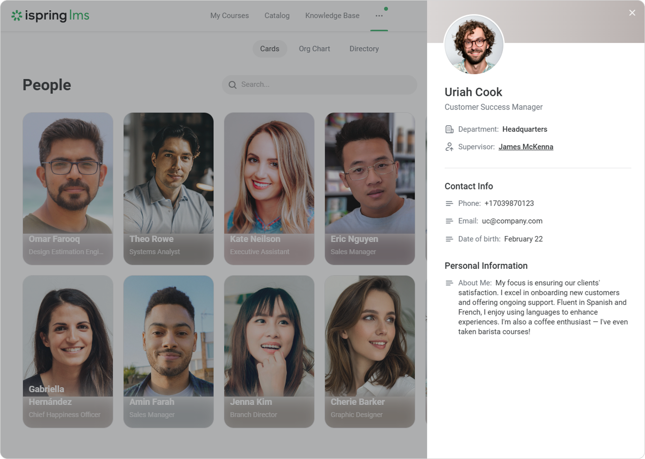 Clicking on a card will take you to the respective employee's profile, where you can find more detailed information, like the department the employee belongs to, their supervisor, and contact and personal information.