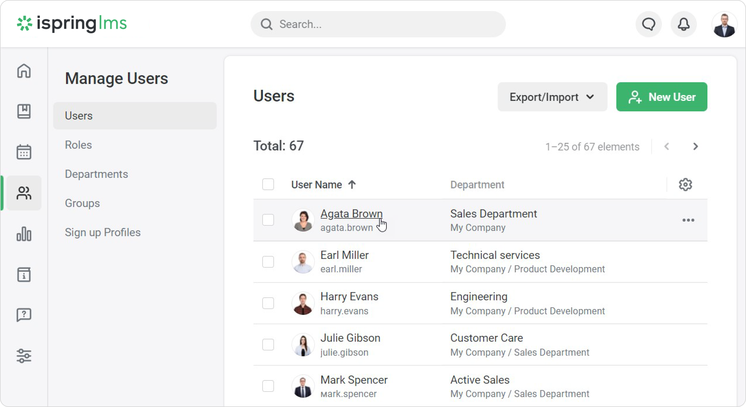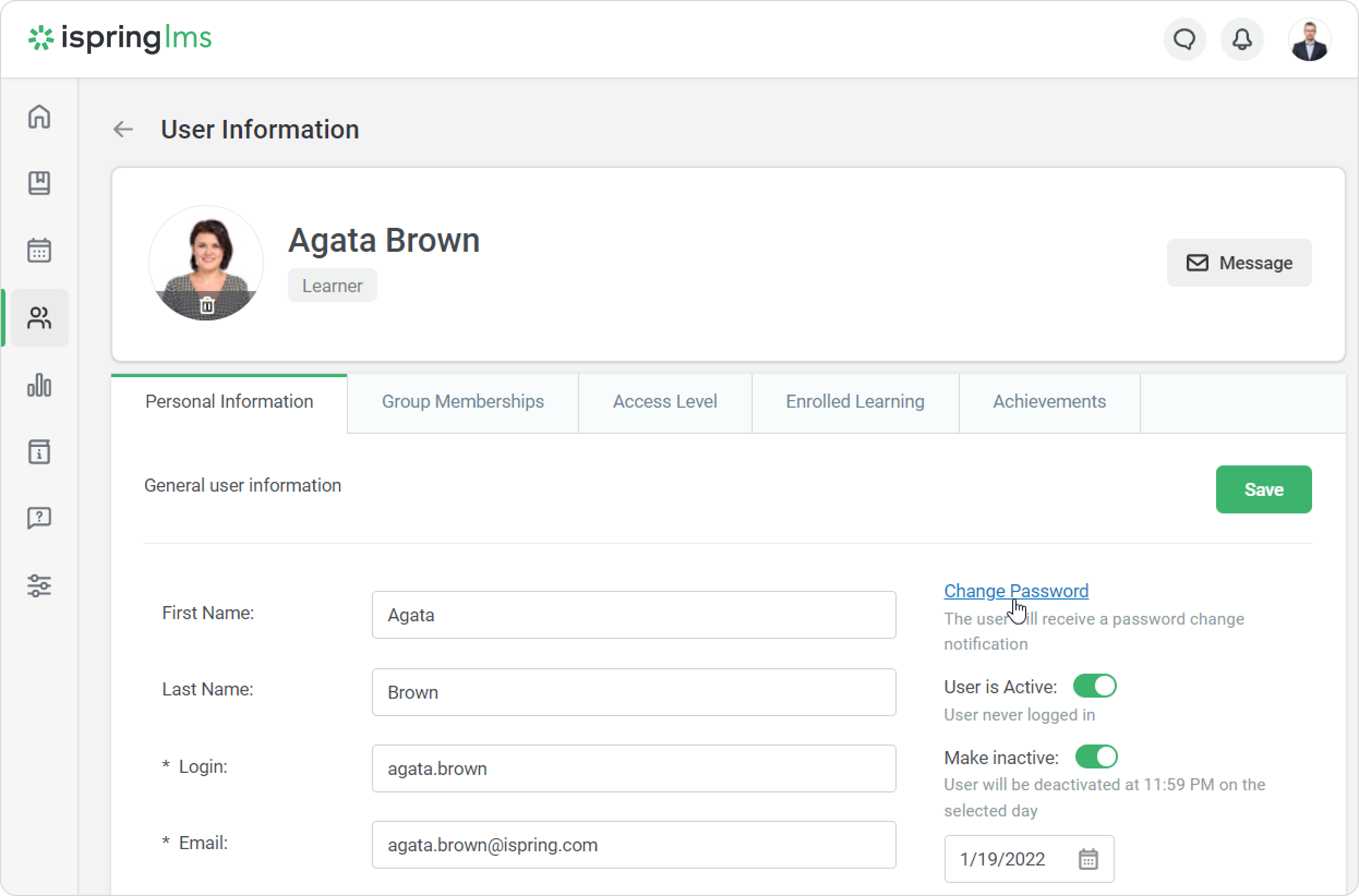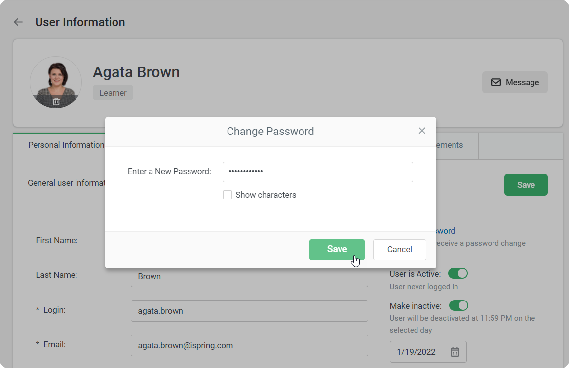 iSpring LMS Users Managing Users Editing Users Current: Changing Password Changing Password To change a user's password:Click the user's name in the Users section.Then, click the Change Password link.Enter a new password into the text field and click Save. You can enable and disable using strong passwords in the Settings section. ×