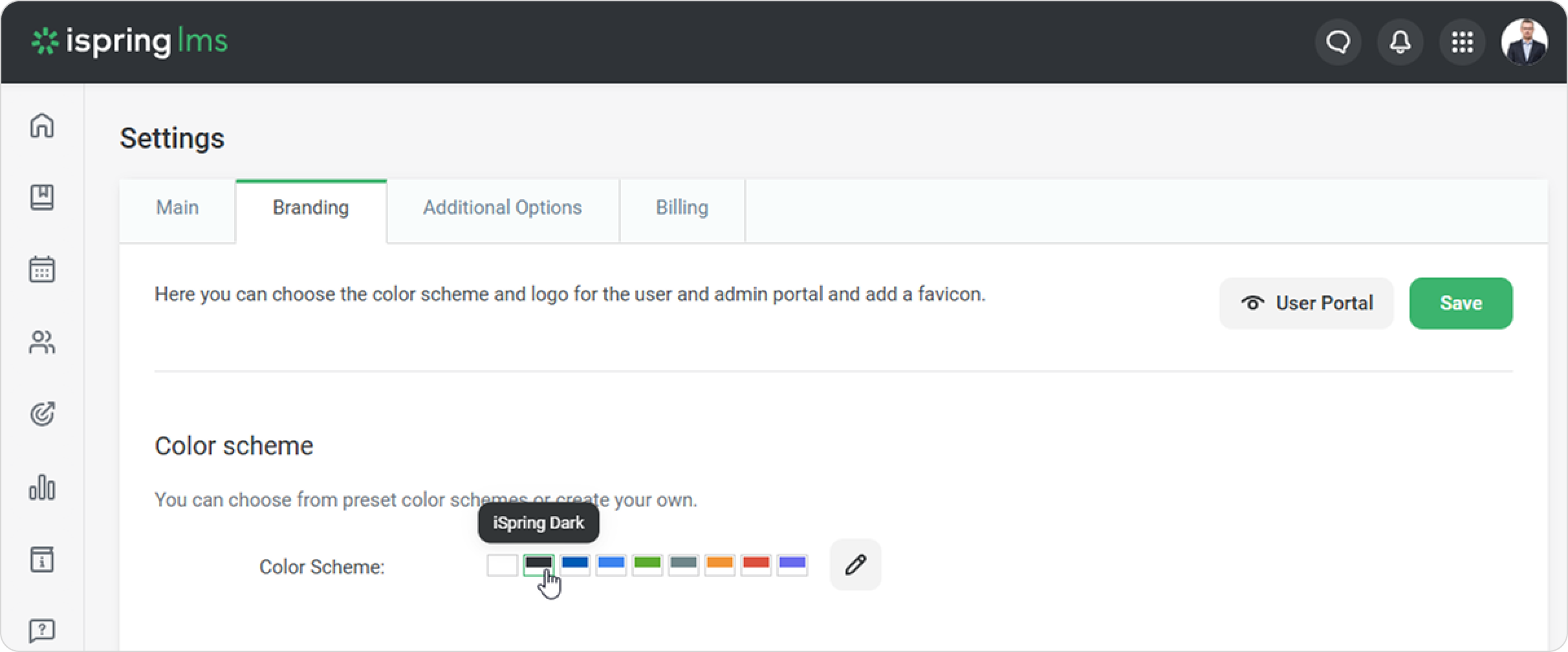 | Top panel text | The color of the elements located on the top panel in the Administrator and User portals, such as icons and inscriptions.