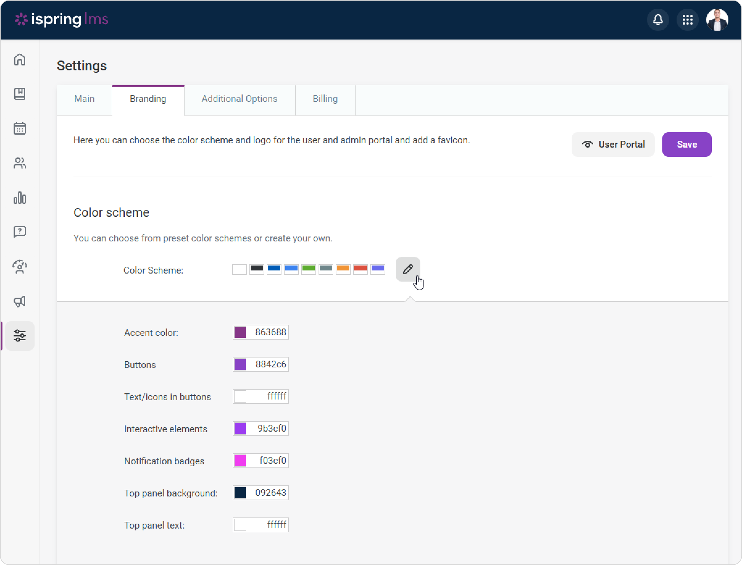 | Interactive elements | The color of the interactive elements in the Administrator and User portals. |