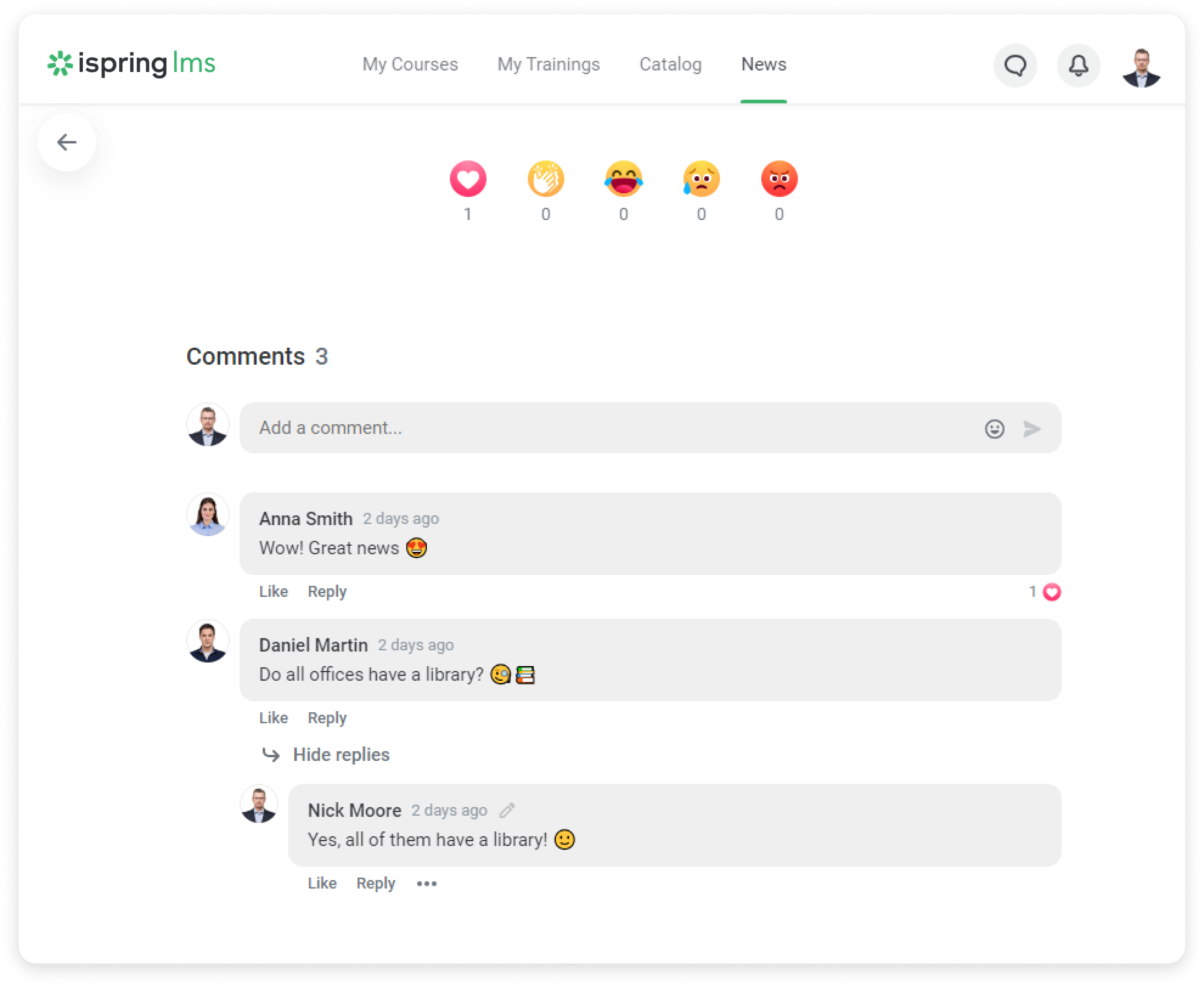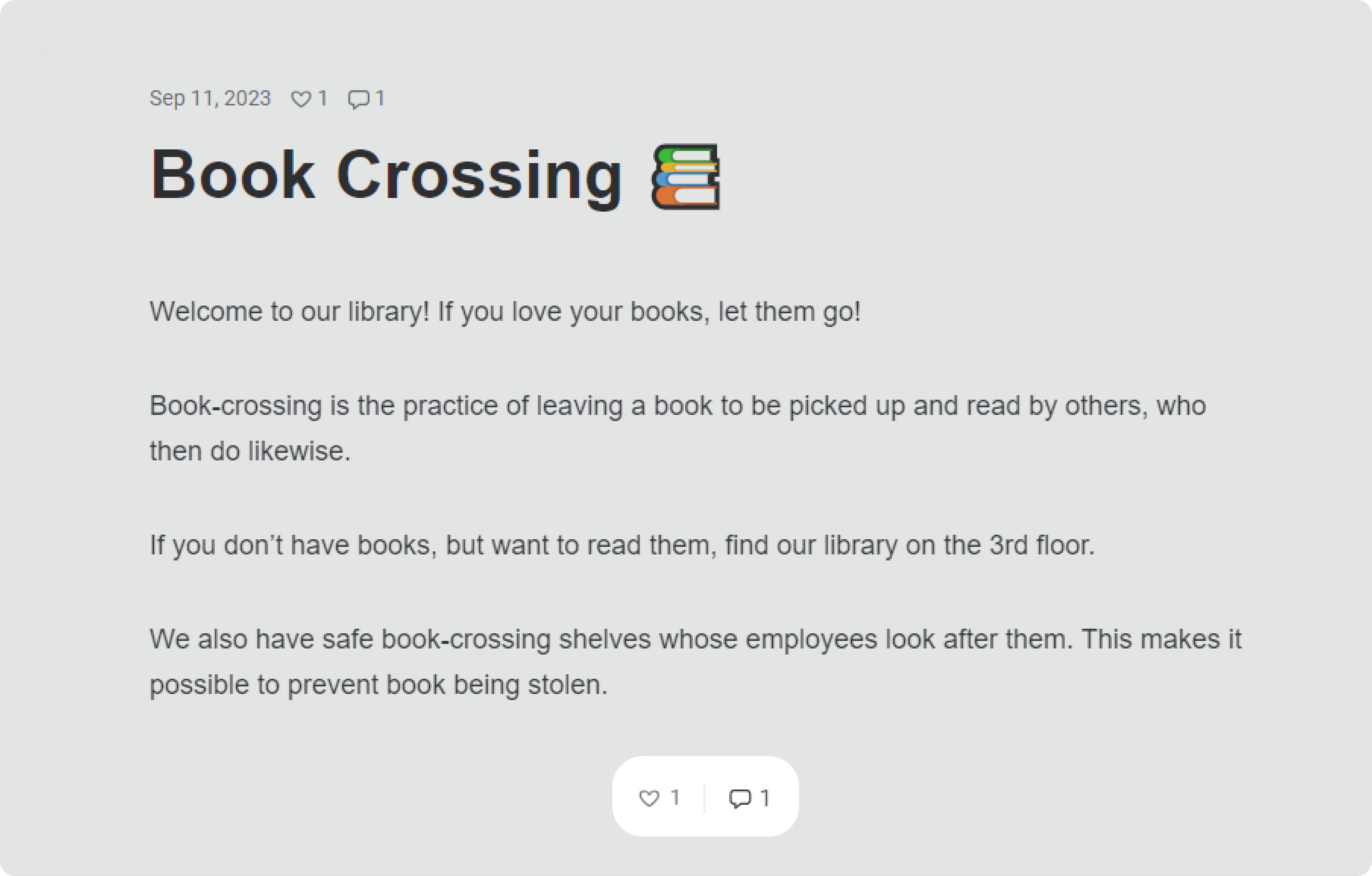 Now employees can comment on newsfeed posts. For example, you can thank the HR team for organizing a great event or ask a question about a post! Colleagues will see your comments and will be able to leave a reaction and respond to you.
