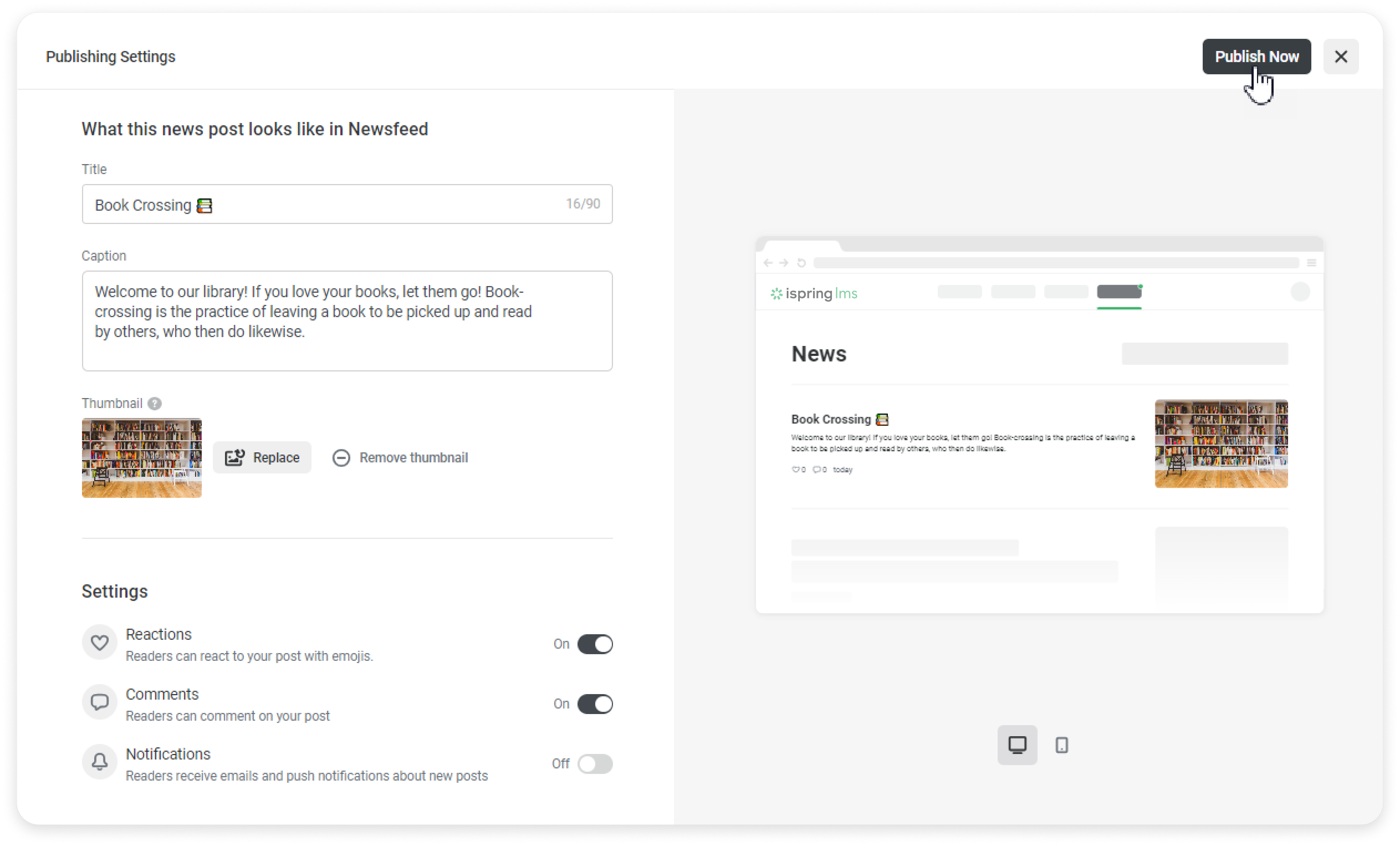 - In the Publish Settings section, enable comments. Then publish the news.