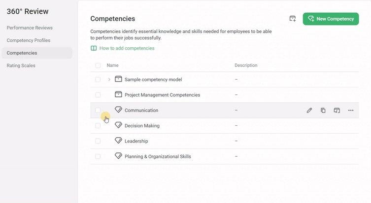 iSpring LMS 360° Review Add Competency Current: Competency Groups Competency Groups Similar competencies can be combined into groups.Return to the list of competencies and click on Create a competency group.Enter a name for the group and click on Create.Select competencies and move them into a group.The competencies are now conveniently located in the group. ×