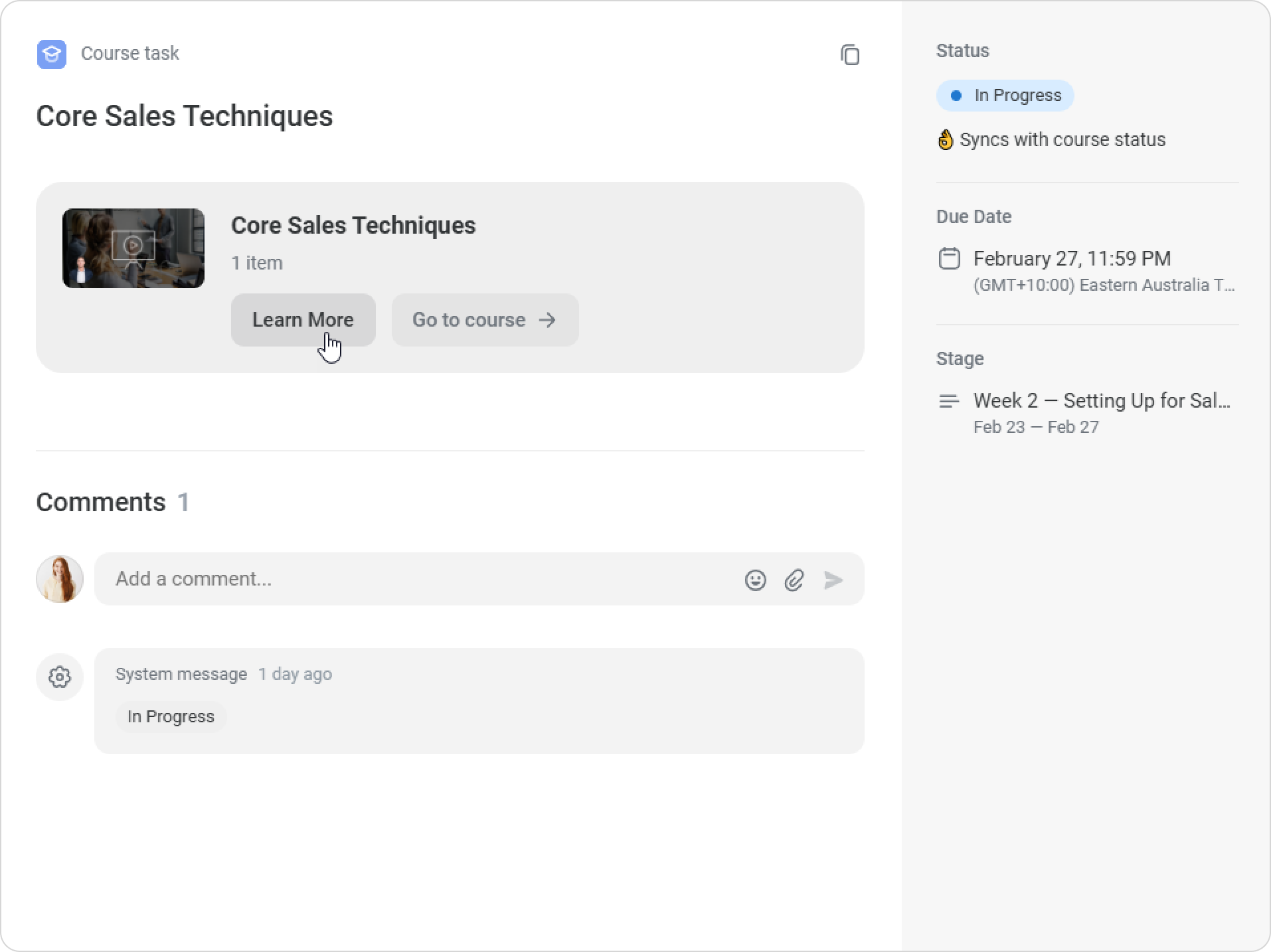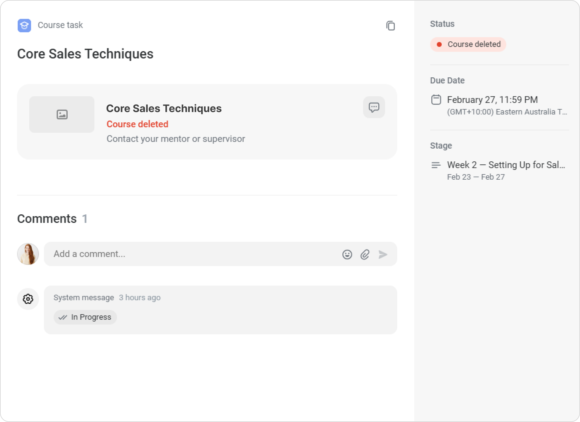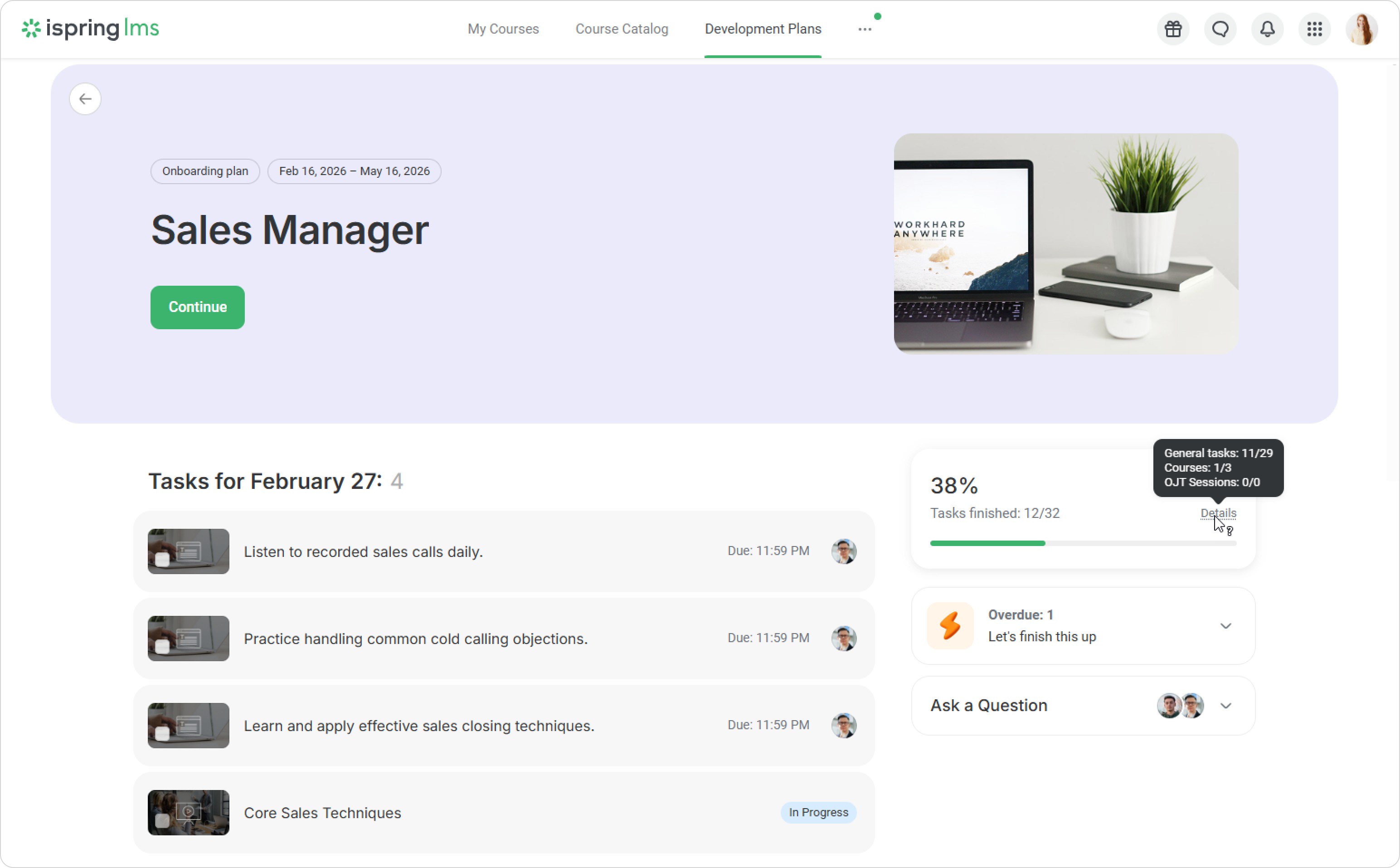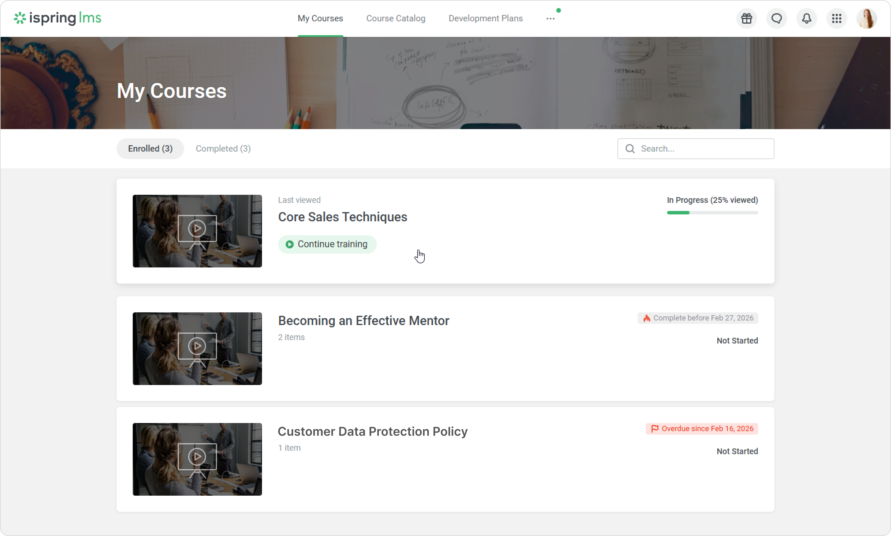 iSpring LMS Development Plans How to Create a Development Plan How to Fill Out a Checklist Courses in Development Plans Current: Completing Courses in Development Plans Completing Courses in Development Plans Go to the Development Plans tab in iSpring LMS and choose the plan you’re enrolled in.On the right, you’ll see task statistics. In Details, you can check how many tasks of each type are included and track your progress.For example, in this plan, the employee still needs to complete two courses.Find the course task assigned for the current stage. It has a distinct cover image and is labeled Course.Click on Learn More to view information about the course instructor, reward points, and other details.When you’re ready to start, click on Go to course.Go through the course content.If you pause your learning, there are two ways to return to the course:From the task, by clicking on Go to courseFrom the My Courses section in the User PortalOnce you complete the course, the task will be checked off in your plan, and its status will change to Completed. If a course has been deleted and you’re unable to access it, please contact your mentor or supervisor for assistance. ×