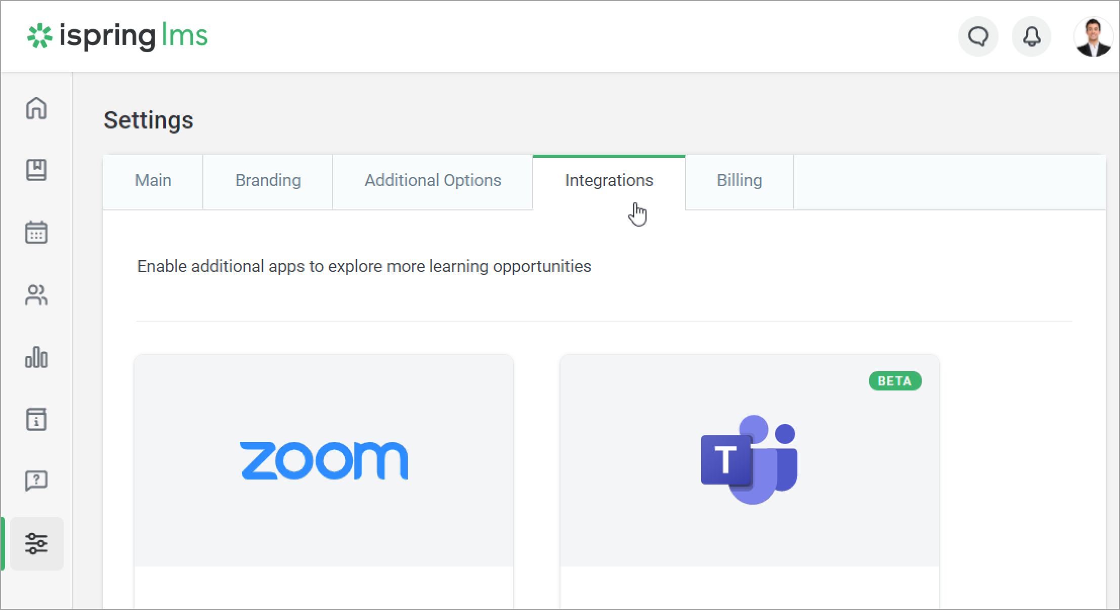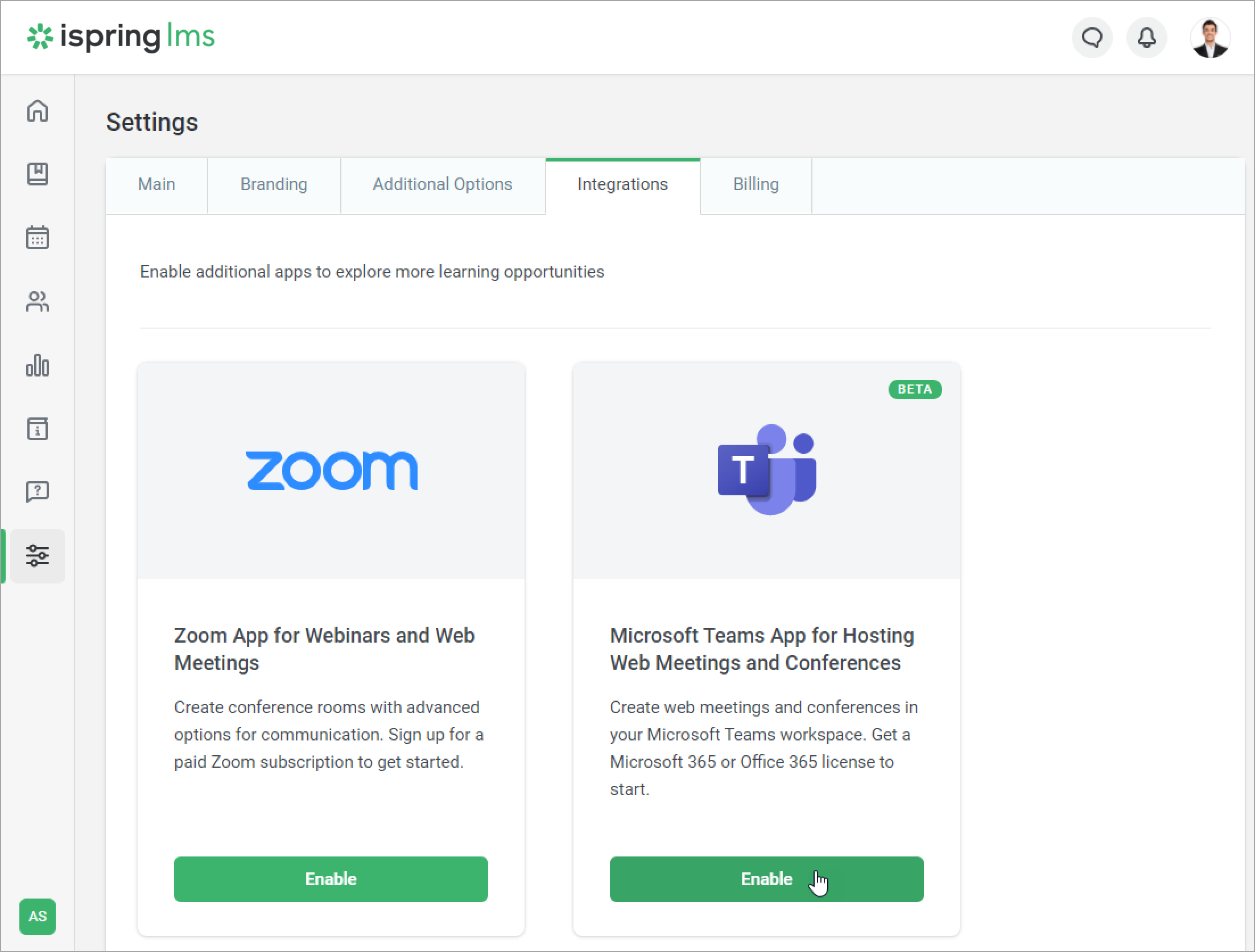 - Only Account Owner and Account Administrators can enable Microsoft Teams meetings in the iSpring LMS account.