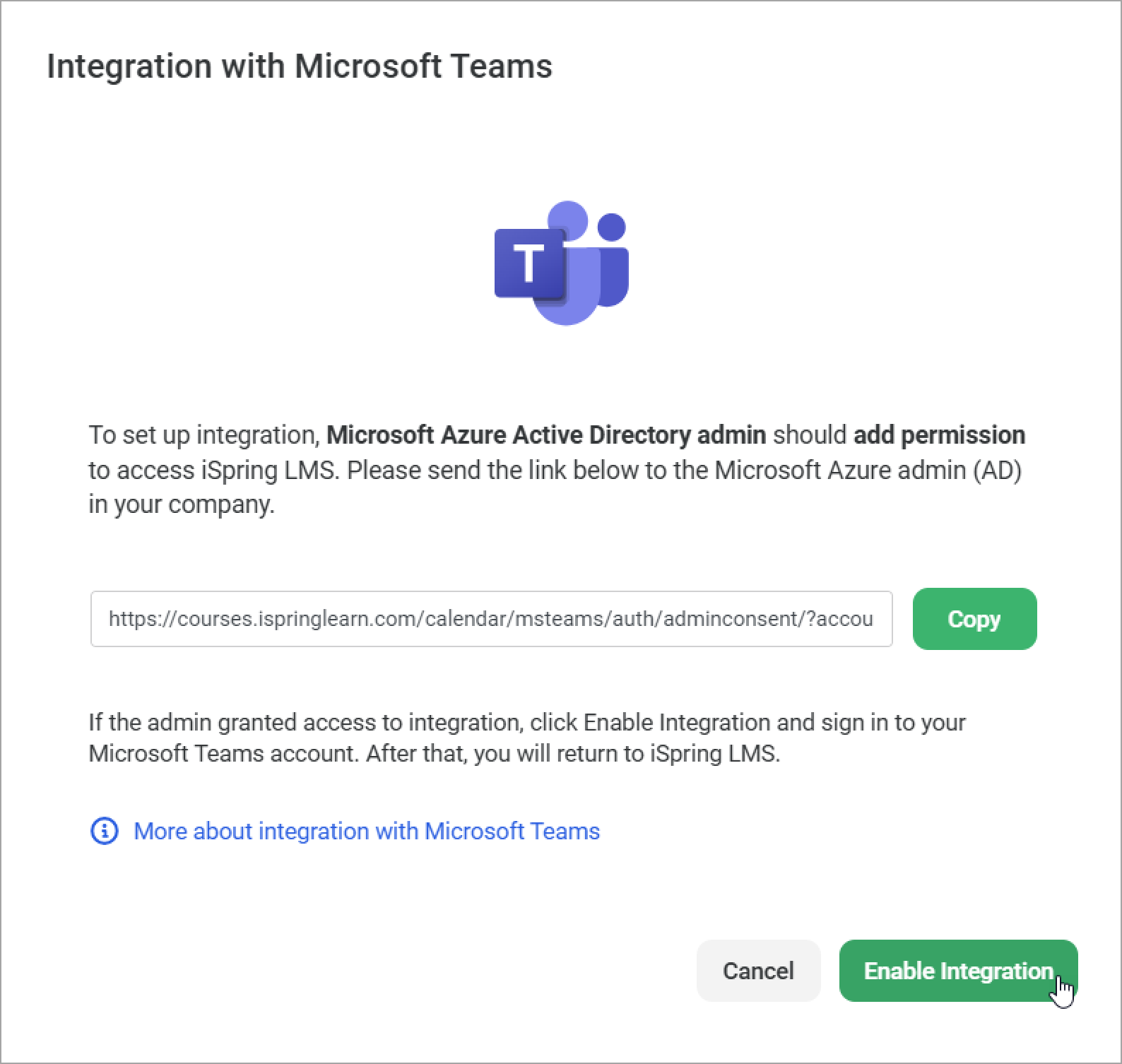 Done! Integration between iSpring LMS and Microsoft Teams is now allowed.- Next, go back to the Integration with Microsoft Teams window and click Enable Integration.