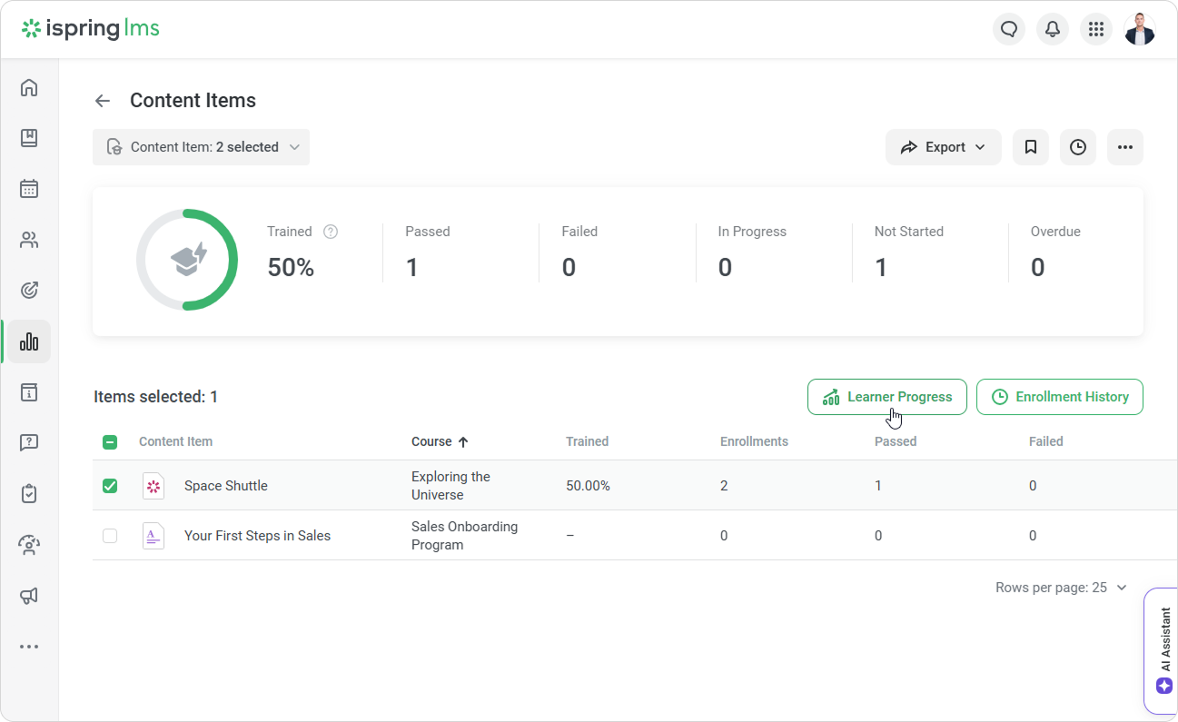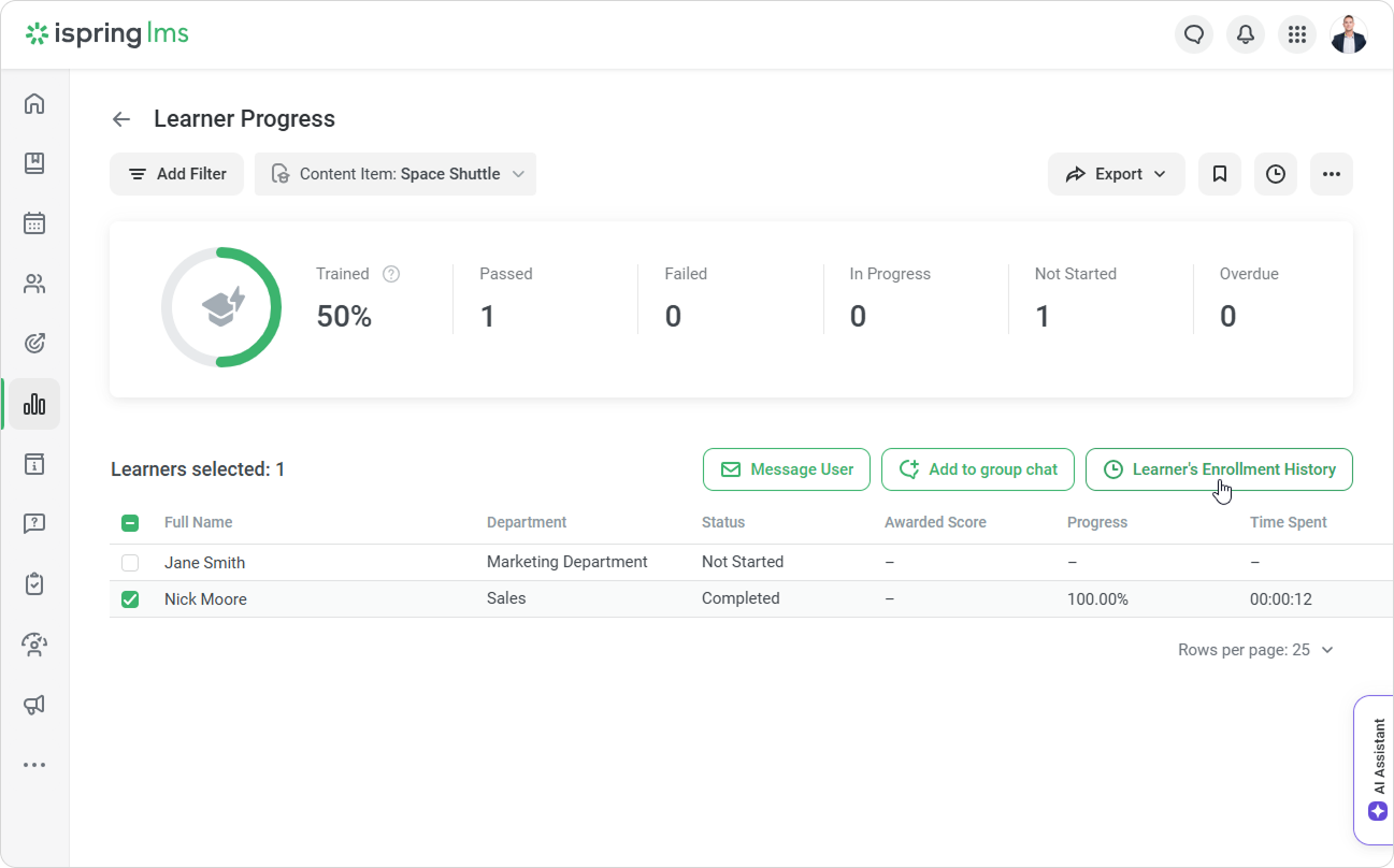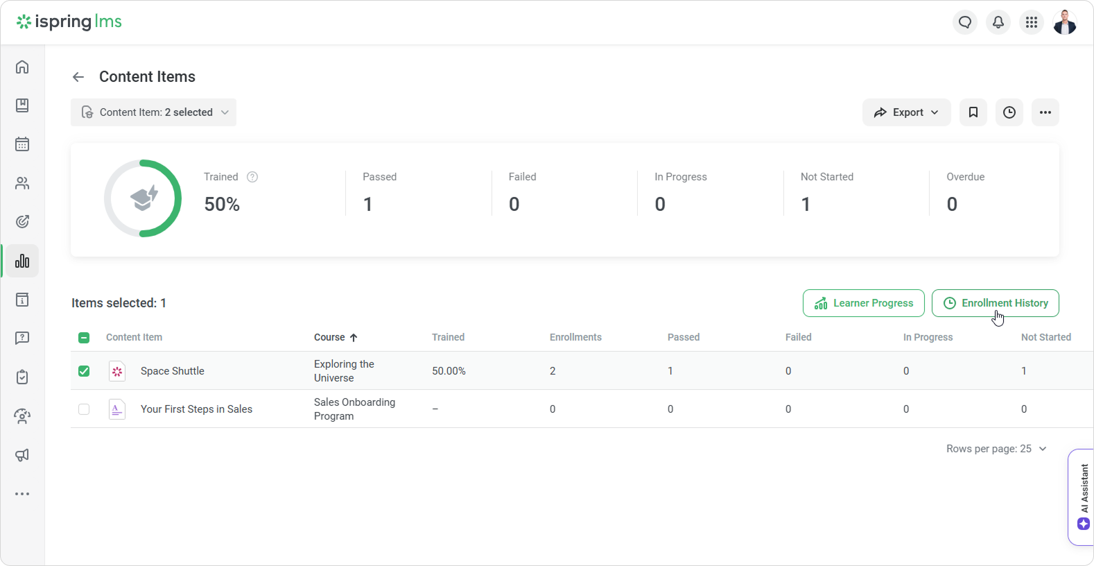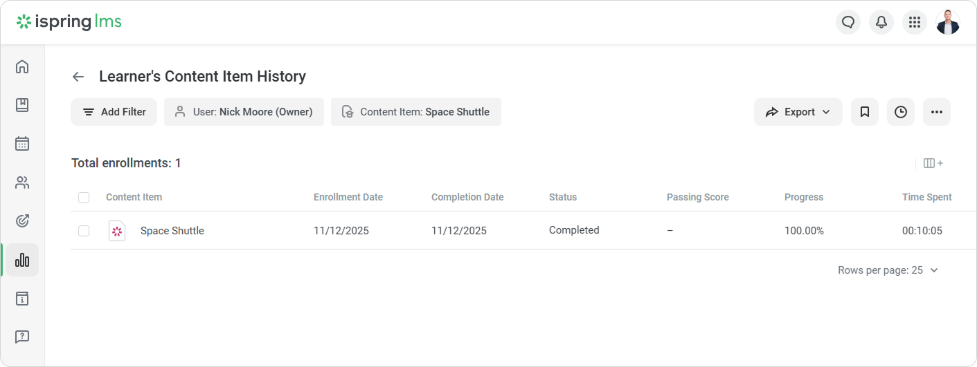iSpring LMS maintains a history of all enrollments, including those that were canceled. No matter how many times the content item was reassigned to a user, the Content Item History and Learner's Content Item History reports record each time that it is taken.