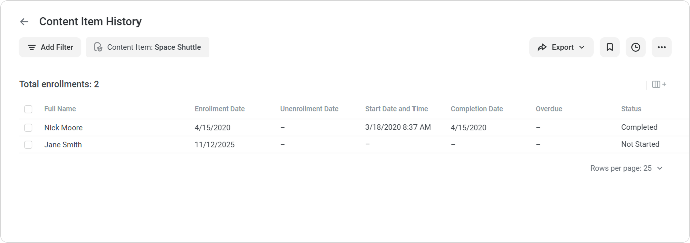 The Learner's Content Item History report on a particular user will open up. It will show all content item enrollments related to the chosen learner.