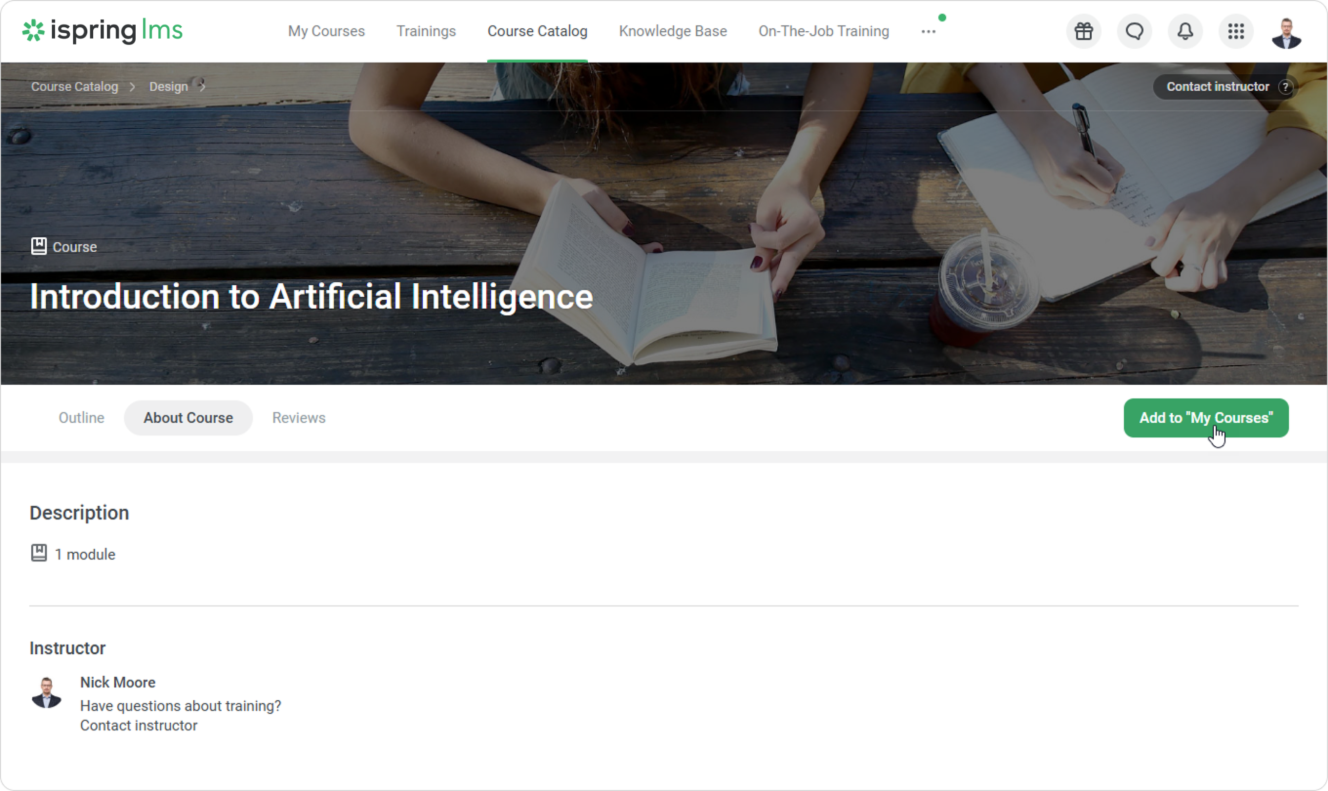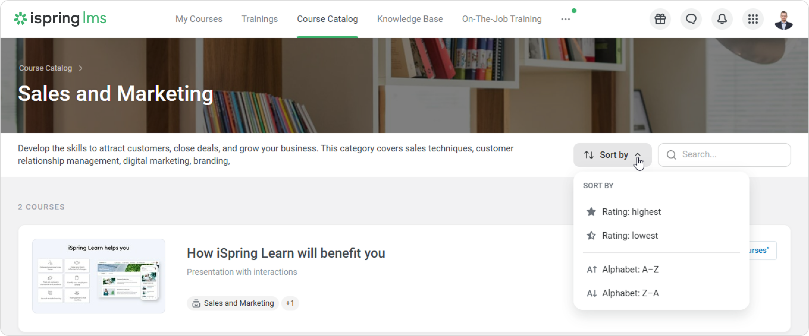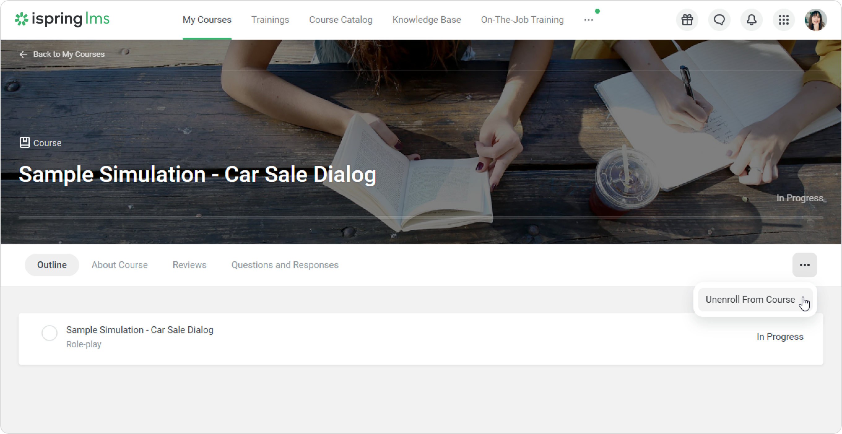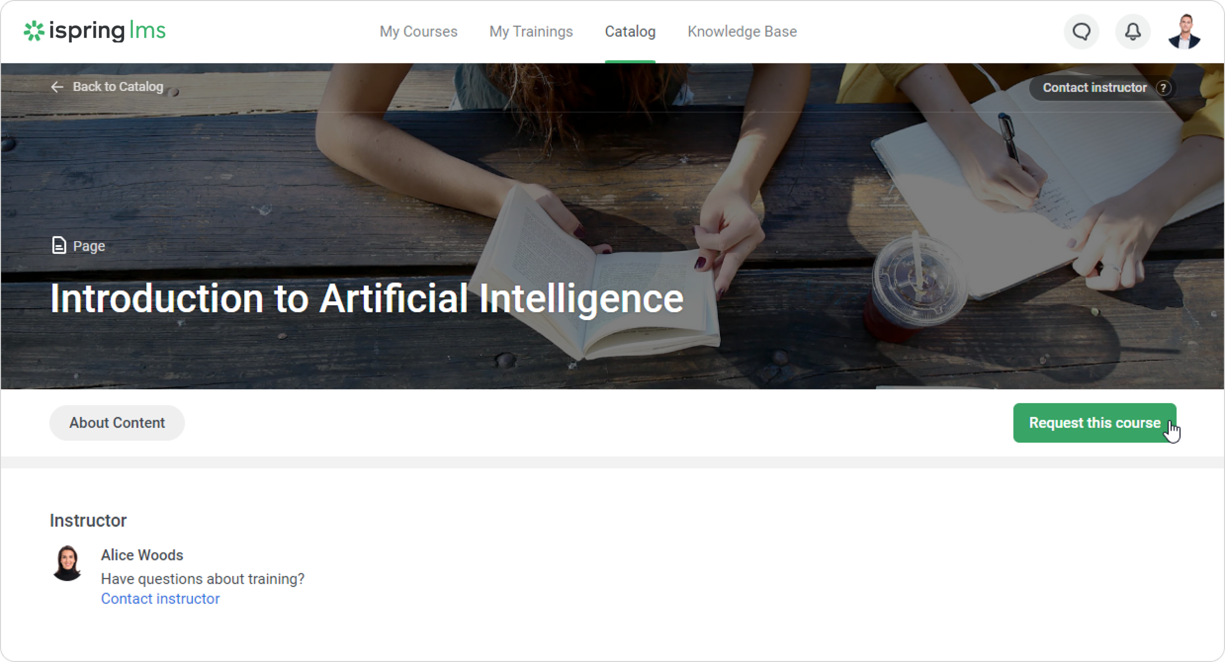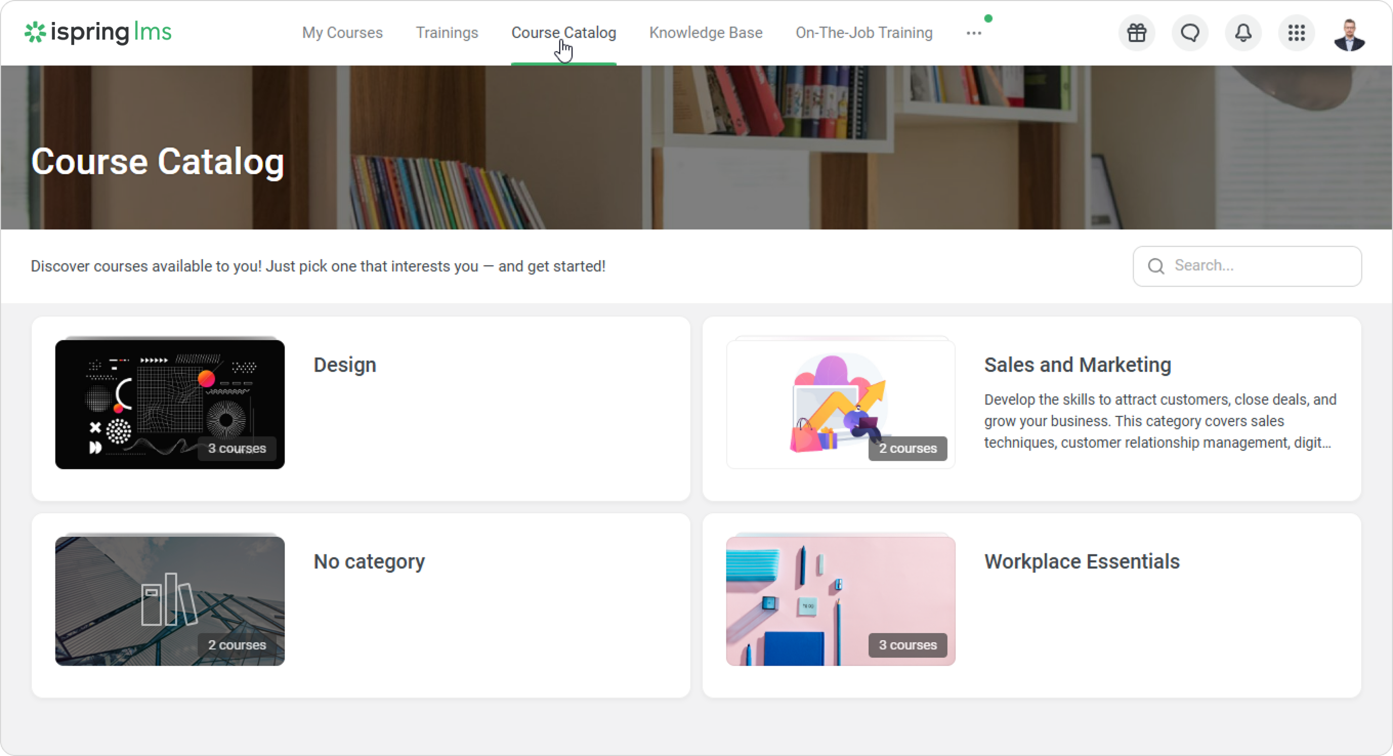 iSpring LMS User Portal Current: Course Catalog in the User Portal Course Catalog in the User Portal Catalog is a collection of additional courses and trainings available to learners in your iSpring LMS account. In the User Portal, go to the Course Catalog section.Here you can find different categories of courses. Select the one you need. Inside a category, you can organize courses by course name or rating.Open any course that interests you and click on Add to "My Courses." The selected course will then appear on the enrolled list. To get approval from the administrator, first send your request to view the course and wait for the administrator's response.How to unenroll from learning content coming from the catalogSelect the content you want to unenroll from in the My Courses or Course Catalog section.Click on the ••• > Unenroll From Course.Submit your decision to unenroll.Done! Now you only see the courses you need. Learners cannot unenroll from the content if:They added a course from the catalog, and the Account Administrator enrolled them in the same course.They have already completed the course. ×