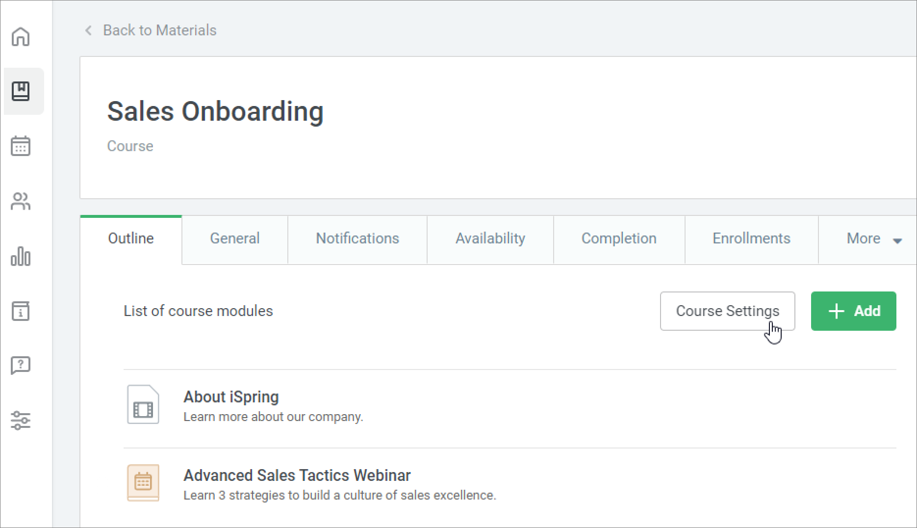 | Complete all modules | The course will be considered passed when students complete/pass all content items and attend all trainings included in the course. |