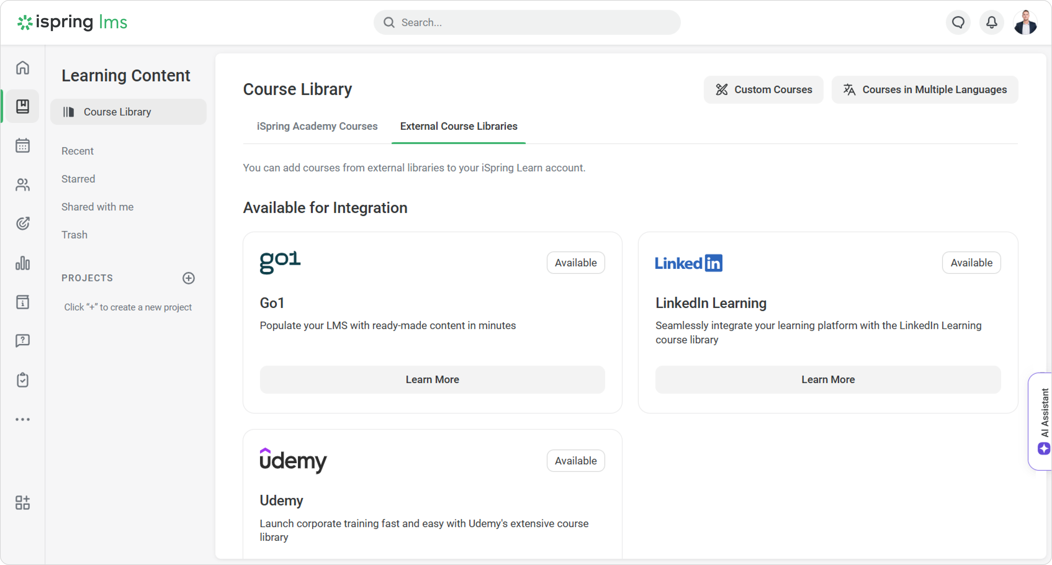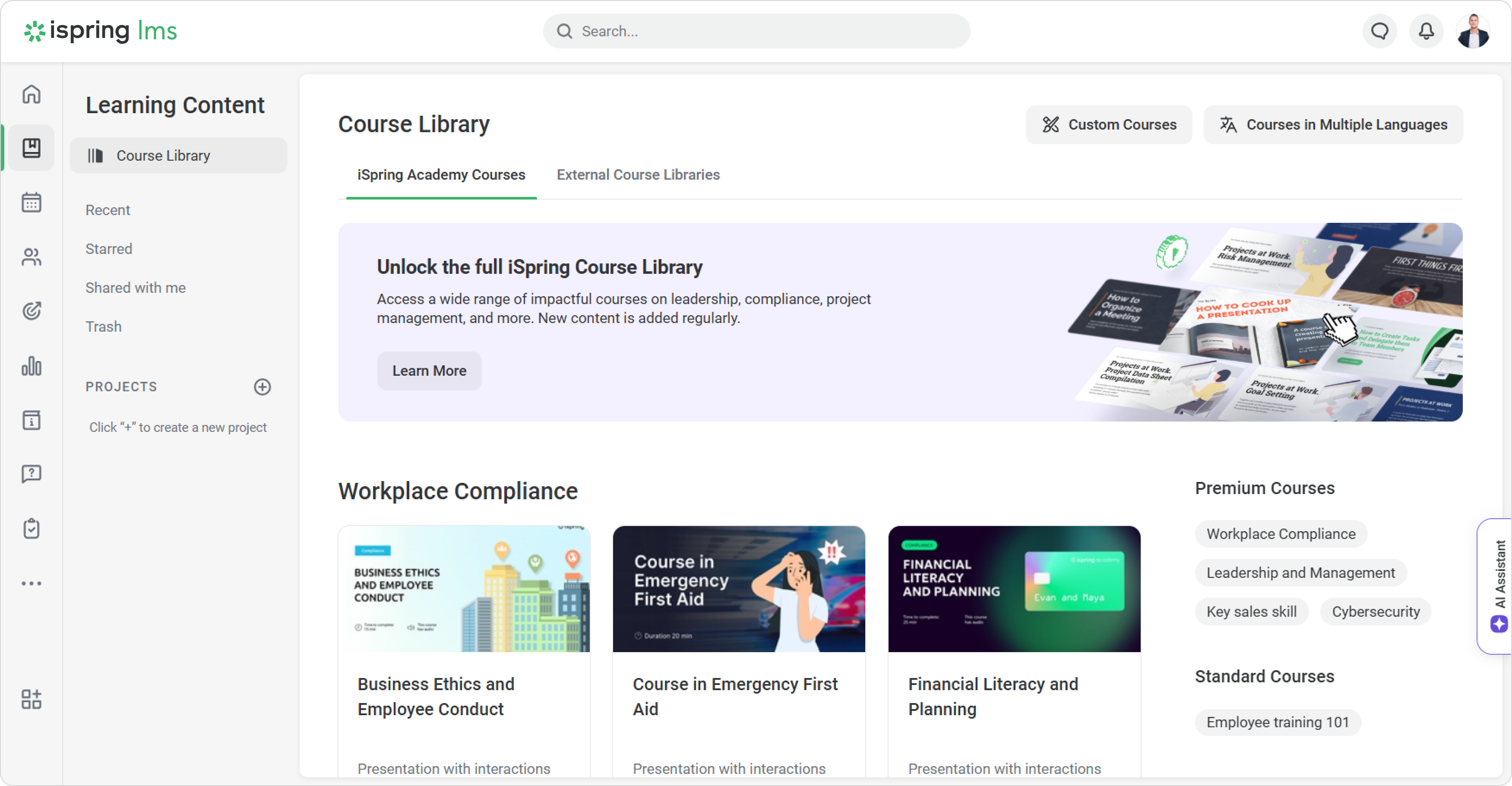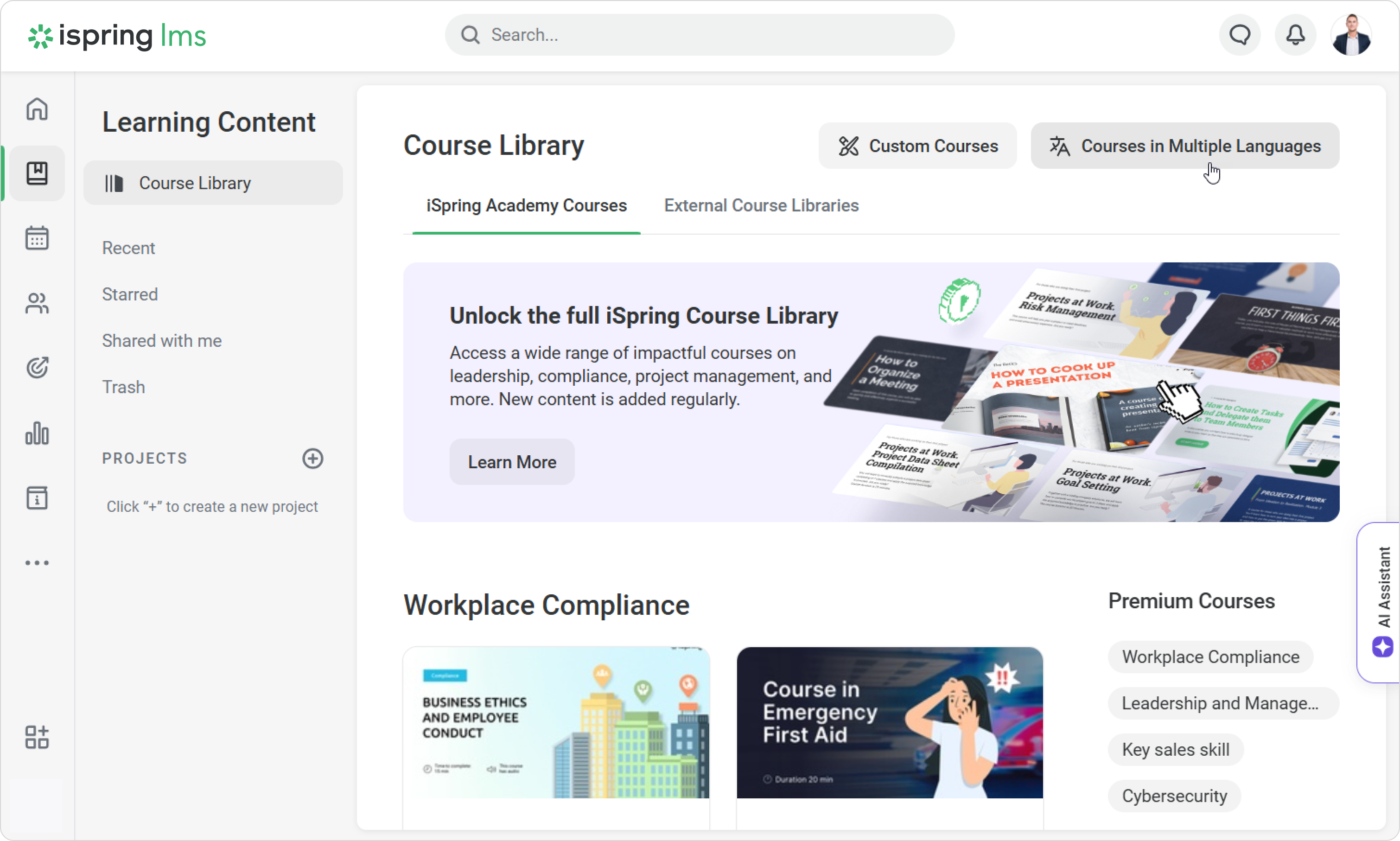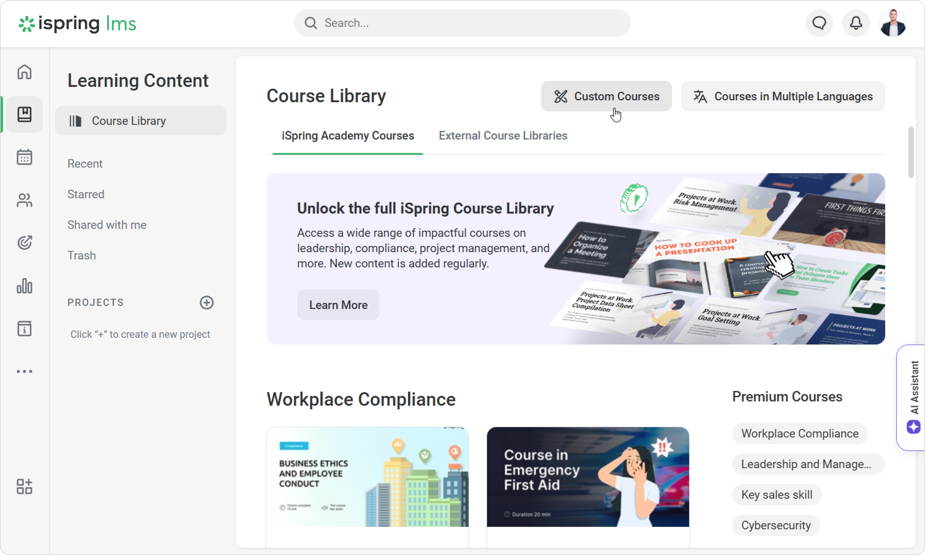 Course Library has ready-made content from iSpring Academy and extra services: Custom Courses and Courses in Multiple Languages.