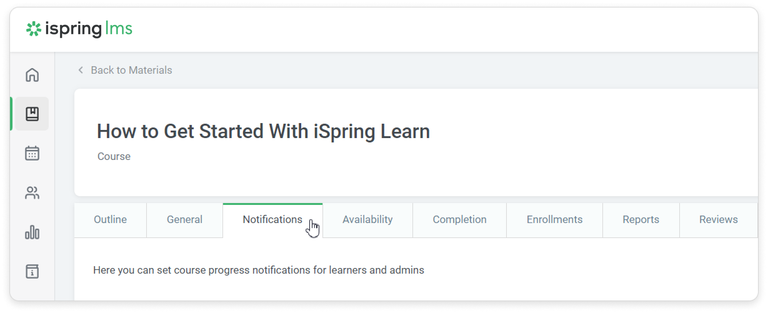 Under the Notifications tab, you can manage alerts that arrive at Learners' and Administrators' emails and accounts.
