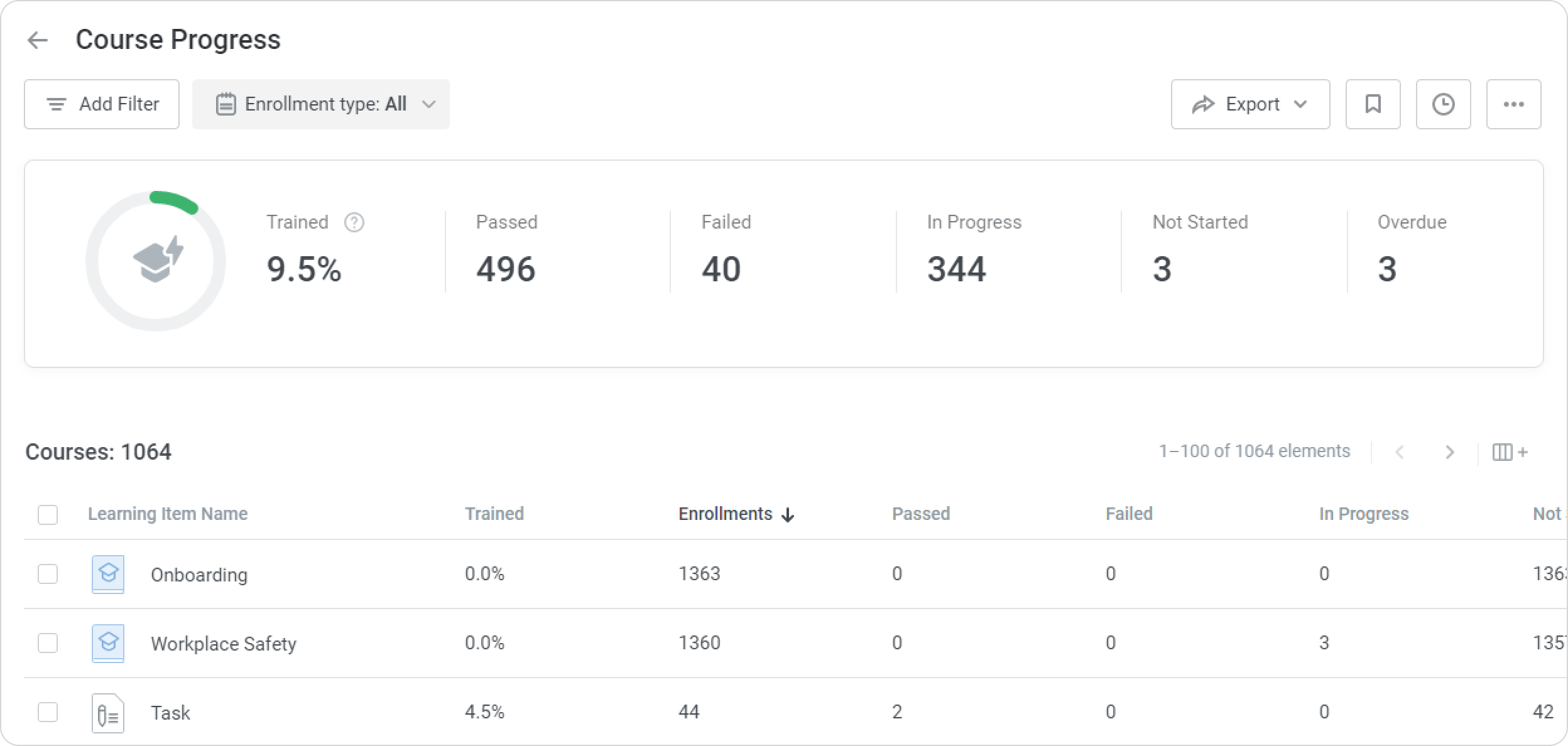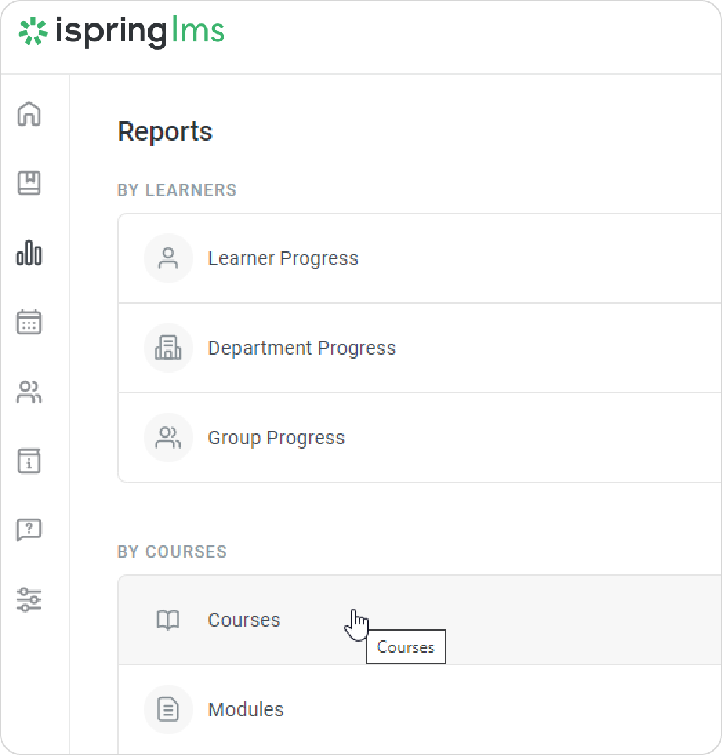A new Course Progress report is a convenient option to check learners' progress on one or multiple courses. You can also check the statuses of courses that have already been assigned to users.