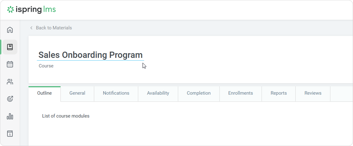 iSpring LMS Learning Content Courses Current: Creating a Course Creating a Course To create a new course:Choose the project, open the Create menu, and select Course.Type the course name and click Enter. Now that your course is created, proceed to add content to it. In the first place, create sections, then fill them with modules. It is recommended to add up to 100 modules to the course to ensure its optimal performance. ×