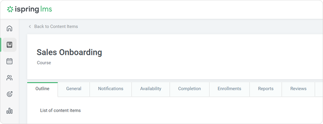 iSpring LMS Learning Content Courses Current: Creating a Course Creating a Course To create a new course:Choose the project, open the Create menu, and select Course.Type the course name and click Enter. Now that your course is created, proceed to add content to it. In the first place, create sections, then fill them with content items. It is recommended to add up to 100 content items to the course to ensure its optimal performance. ×
