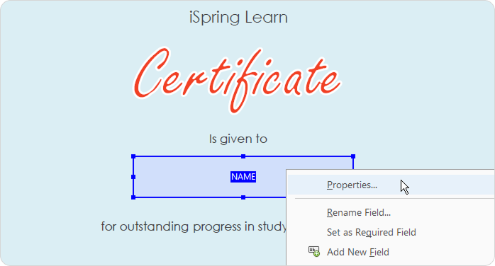 - Second, we will add a new text field that was not previously available in the certificate template. To do this, right-click, choose Text Field, select an area where the field will be located and insert the value. In this example, we have added the NAME form field (the name of the learner who completed the course will appear here).