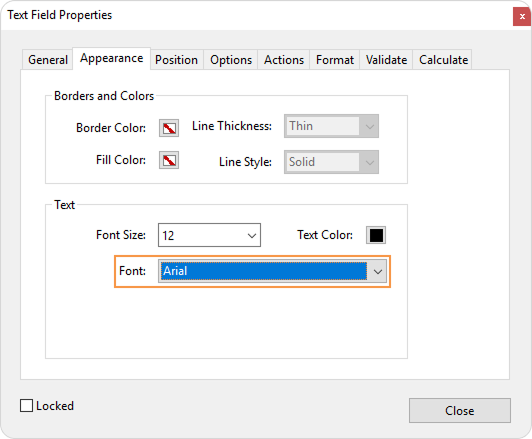 b. In the Text Fields Properties window, open the Appearance tab and choose the font you need in the Font menu.