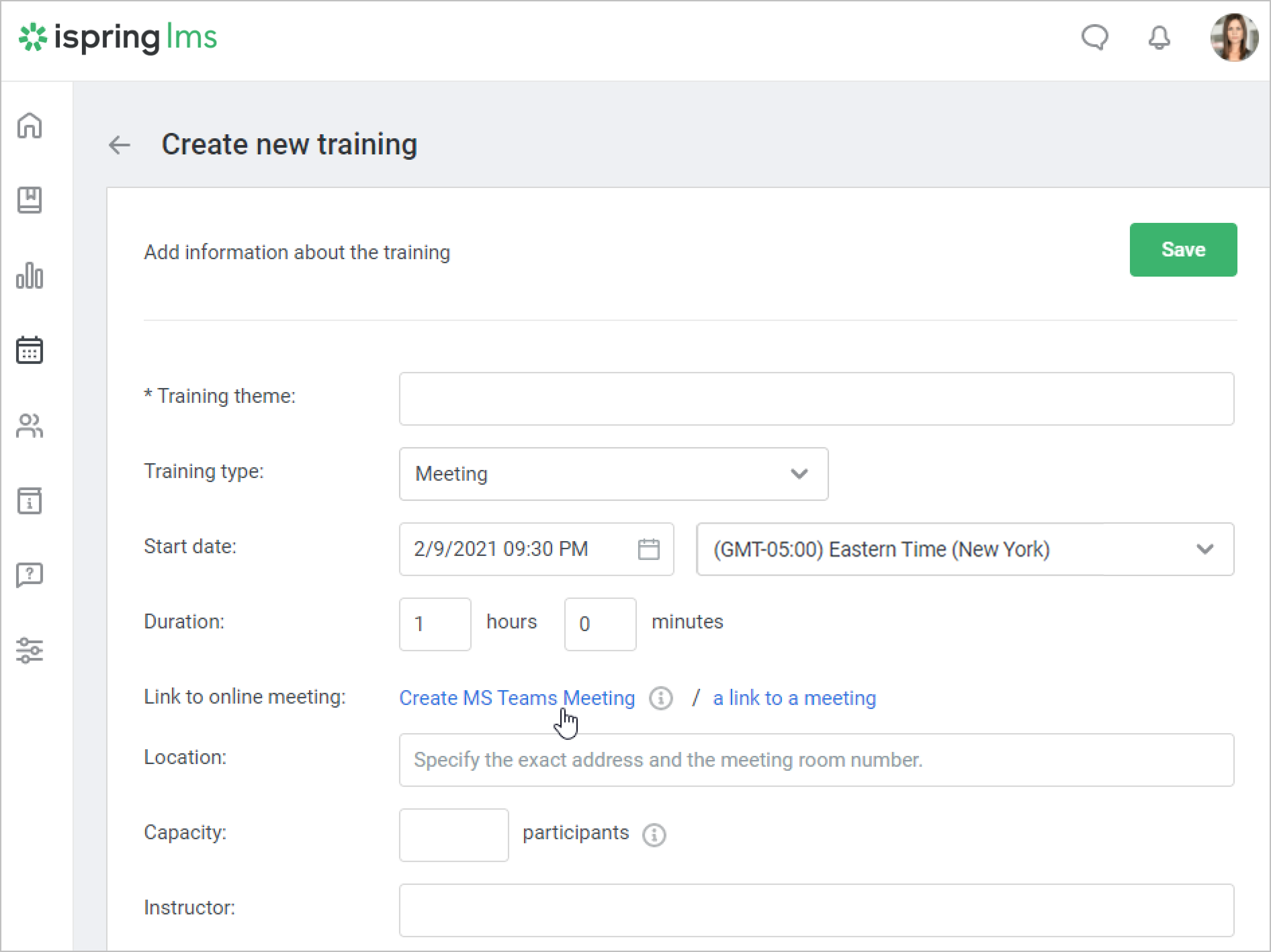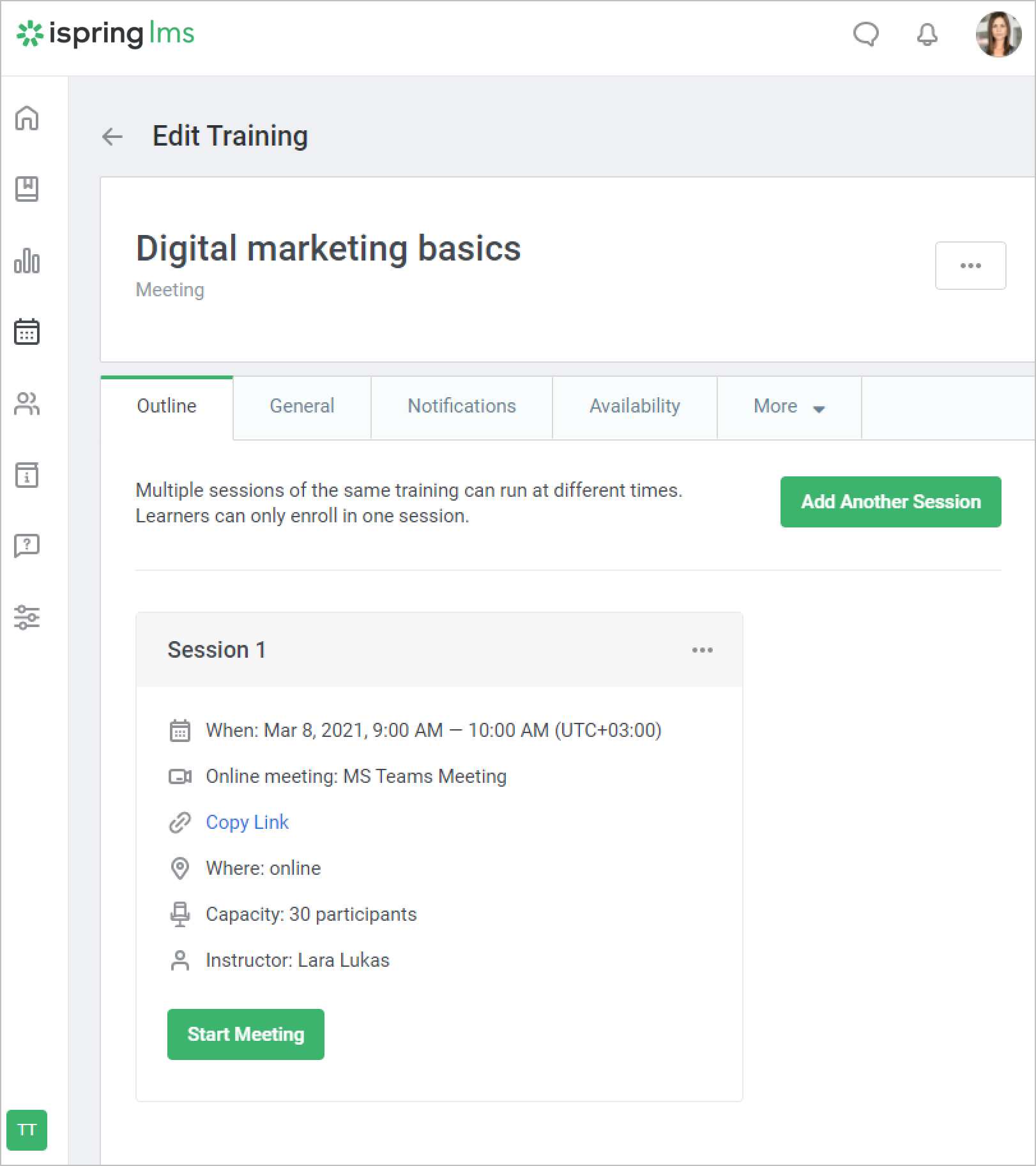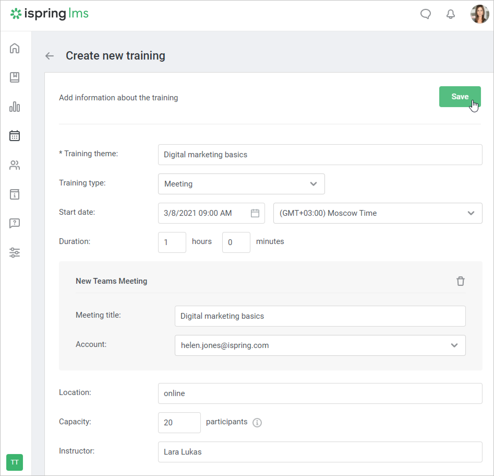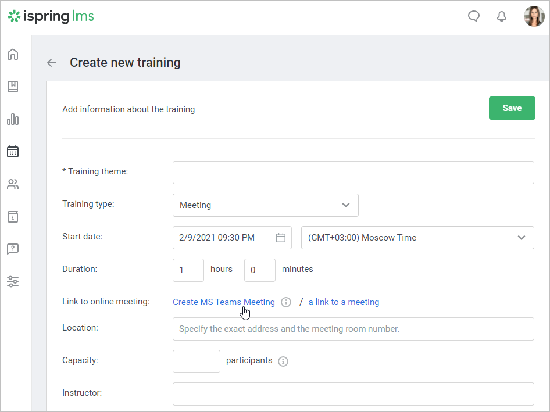 After Microsoft Teams is connected to your iSpring LMS account, you can start scheduling and holding Microsoft Teams meetings.
