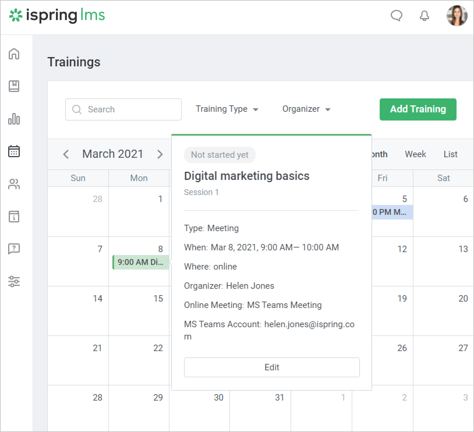 The Microsoft Teams account administrator will see the meeting both on the calendar in the iSpring LMS account and the calendar in the Microsoft Teams account.