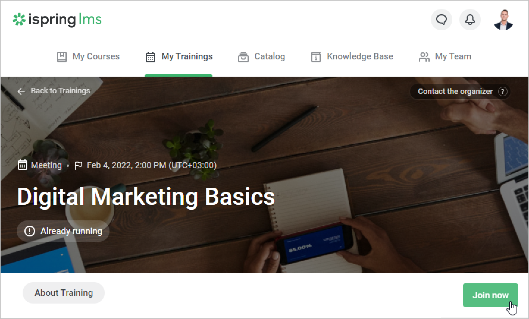 • The user's emails in iSpring LMS and Microsoft Teams should coincide. For this to occur, users' emails should be located in the Office 365 space and not on the corporate servers. - As soon as the organizer launches the meeting in the iSpring LMS admin portal and logs in to their Microsoft Teams account (where the meeting was created with iSpring LMS simultaneously), the meeting status will be changed to Already Running and the Join now button will appear on the meeting page in the user portal.