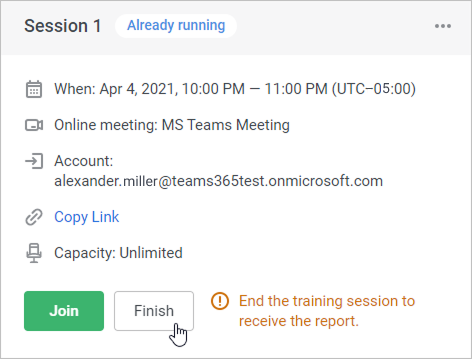 In fact, the meeting will be finished automatically 24 hours from the start date, or you can finish it manually in your Microsoft Teams account. - If the organizer launched the meeting before the start date or finished it later than the specified time, then before finishing the meeting, they can edit the session and specify a different start date and duration.